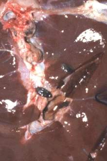 On peut noter une hypertrophie de la paroi des canaux biliaires avec présence des douves à l'intérieur. Le foie peut-être hypertrophié ou au contraire atrophié. Il présente des lésions de cirrhose avec fibrose du parenchyme hépatique provoquée par la migration de jeunes douves.