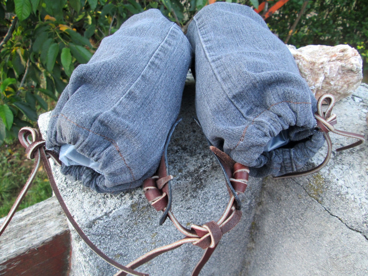 | Dire merci | ![]() ![]() Le jeans est élastique,c'est plus pratique et plus souple.Le fond est en cuir de doublure (chutes) et les pattes d'attaches en supportlo (chutes aussi) C'est très pratique pour en avoir eue pendant des années dans mes randos pour les granulés et sa se lave a la machine ![]() |