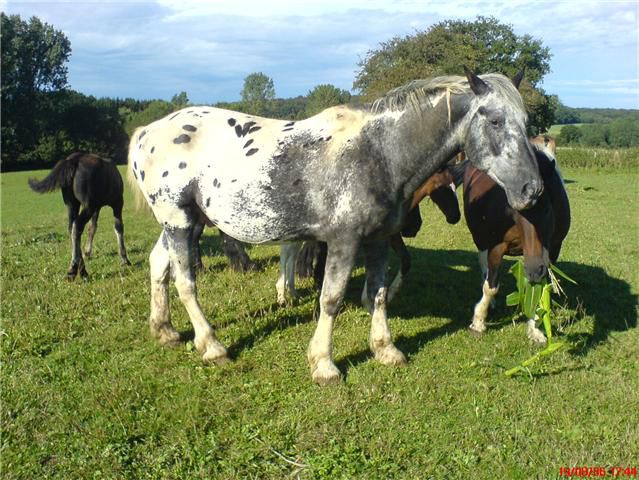 | Dire merci | ben elle est pie avec un leopard minimum, "tout simplement" ![]() donc si tu croises avec un non appaloosa, tu auras probablement (une chance sur 2) d'avoir des marqueurs de la robe léopard qui apparaitront sur le produit, comme c'est le cas sur ta jument ![]() |