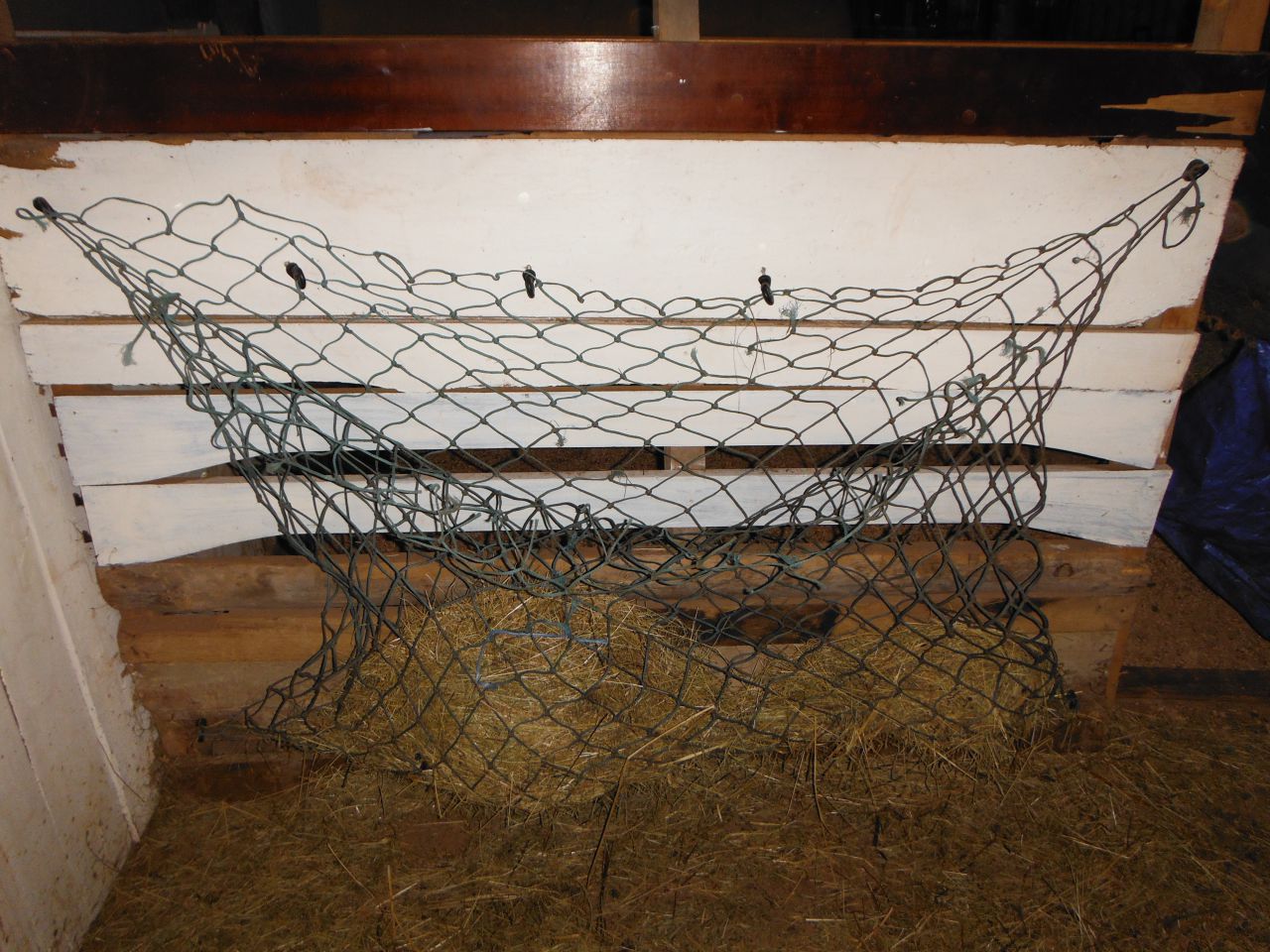 | Dire merci | Mon homme a récupéré des filets anti chute sur un chantier. On en a accroché un dans tout le fond du box (6 de long x 2,5 de haut). Et de l'autre côté du box on a fait une trappe ou on balance le foin. On y rentre 10 à 15 bottes de foin de 20-25 kg !! Ça tient 2 semaines environ. (Les filets anti chute sont de la même matière que les filets pour chevaux) |
