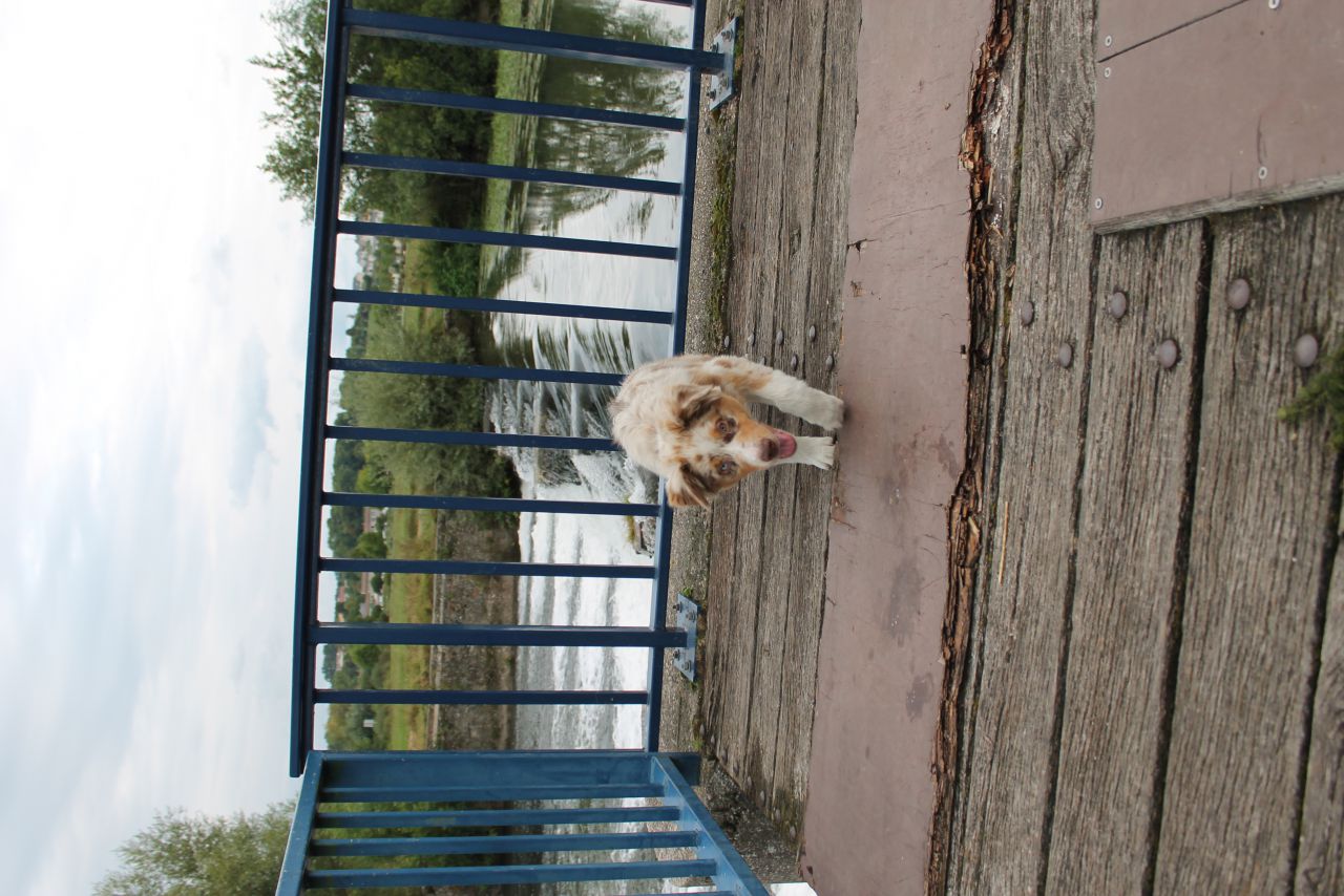 | Dire merci | Alors les chiens en général je me met a leur hauteur pour les prendres en photo (mise a part de contre plongée importante mais c'est pas facile) la j'ai l'impression que tu as pris la photo debout ? Tu a attendu un moment ou le chien est expréssif, top . par contre moi les barreaux du pont me dérange, le fond en photo c'est super important pour mettre le sujet en valeur |