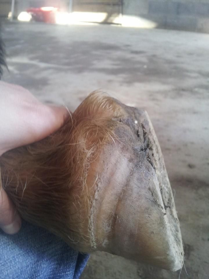 | Dire merci | Je n'ai rien lu mais je vais intervenir... Le pied s'est affaissé sur lui même en quelques jours suite au parage, le cheval mettant tout son poids en externe au moment du posé en vrillant le pied, sans répartition égale... Il s'agit donc bien de stries mécanique de déformation... Je pare personnellement mes chevaux car les MF sont mauvais dans la région... 7 mois de formation pour certains, avec un diplome au rattrapage, avec une formation uniquement axée sur les fers et la forge (quasiment aucun parage) et ça se dit MF... Si je devais ferrer je n'ai que 3 professionnels à qui je confierai mes chevaux et ils ne prennent ni nouveaux clients ni ne se déplacent... Le dernier MF qui a paré mon cheval m'a dit après que je lui ai demandé pourquoi il laissait autant de corne "il faut bien que je laisse de quoi travailler le pied pour quand vous viendrez pleurer pour que je pose un fer"... Se sont des poseurs de fers, ni plus ni moins qui résolvent tout par la ferrure la seule chose qu'ils connaissent... Là Fanfan va mieux (merci aux terrain abrassif qui ont activé la pousse de corne)... |