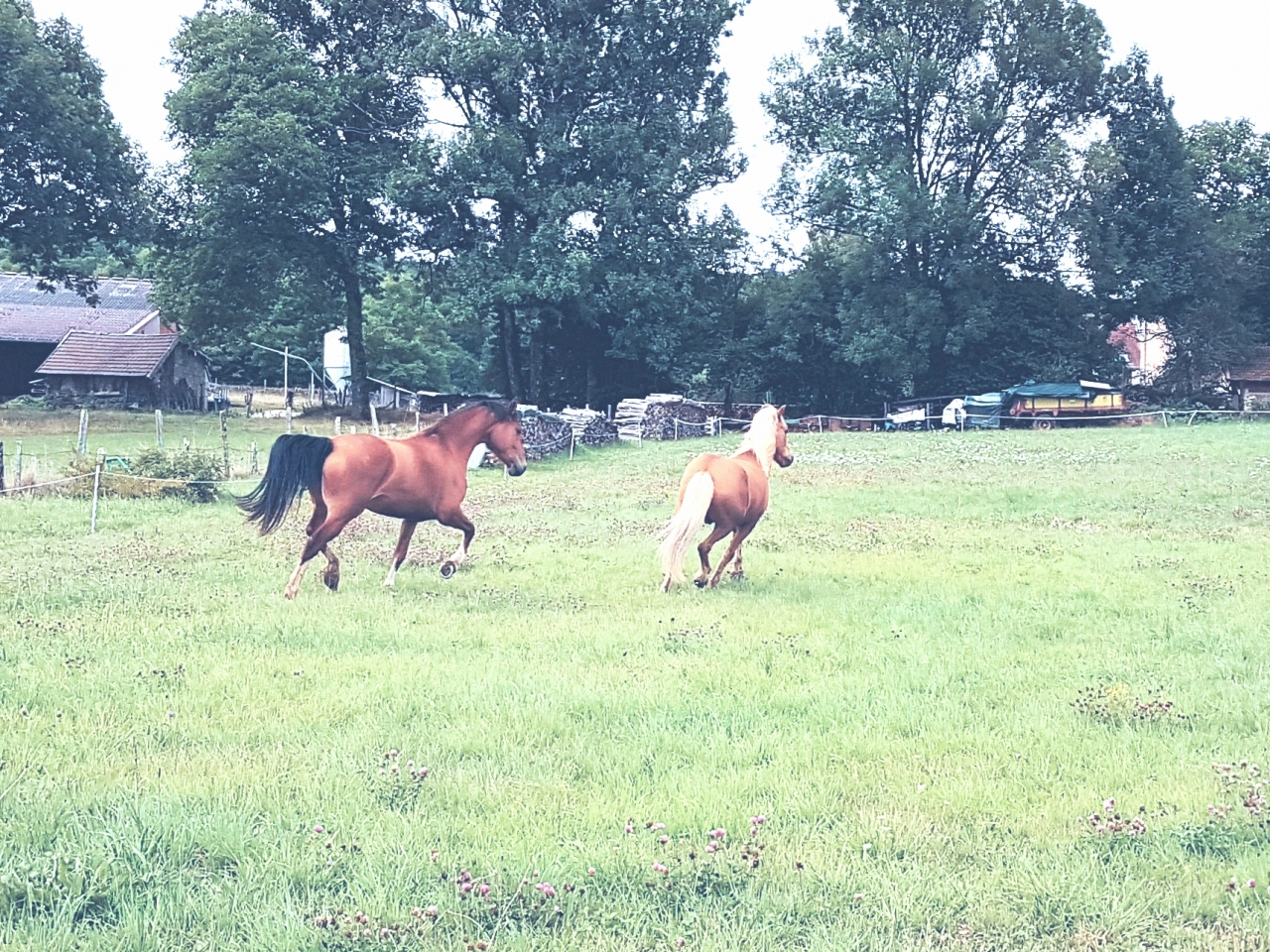 | Dire merci | Merci vous ! Jarpur va mieux. il hennit encore un peu de temps en temps mais ne cours plus. Et il commence à se rapprocher de cobra... enfin ils gardent encore un bonne distance entre eux. mais ce n'est plus chacun dans un coin du pré ^^ Pour la séparation, c'était notre préoccupation principale. Dès les premières heures on les a séparé quelques minutes. Cobra n'a aucun problème pour rester seule au pré quand jarpur part. Et il part bien tout seul. L'inverse est plus compliqué... Cobra part bien seule mais Jarpur a toujours refusé catégoriquement de se retrouver seul au pré. Il se met dans un état de stress assez impressionnant. Il transpire a grosse gouttes en quelques secondes. Hurle à la mort. tremble. a la yeux qui lui ressortent de la tête... En 20ans il n'a JAMAIS JAMAIS été seul. Il est né en troupeau. il a toujours vécu en troupeau de minimum 14 individus. n'a jamais été en box. jamais isolé pour maladie dans un paddock.... Alors j'avoue que vu son stress depuis son arrivée. On a pas tenté la séparation dans ce sens là... pour ne pas en rajouter une couche Et puis dès septembre il va retourner en troupeau de toute façon... et moi je ne part pas encore en balade seule donc c'est pas grave s'il faut qu'il vienne avec nous Le principale c'est que Coco accepte tout ça. Partir seule. Rester seule. C'est ok pour elle. Sinon on a fait notre première balade en famille (humaine/équine) ! Et vin diou.... j'avais oublié a quel point les islandais marchent vite... surtout que jarp est tendu comme un string... alors il marche/tölte comme un taré et Coco n'arrive pas a suivre au pas. donc elle rattrape au trot... et je me fais secouer comme un prunier ^^ il va falloir qu'on s'accorde... que coco accélère et que lui ralentisse c'était un peu chaotique... mais sinon cobra a été géniale comme dab... on a commencé par la route pour rejoindre le bois. des voitures sont passées, elle a un petit peu accéléré mais très gentiment. on a trotté rênes longues. on a galopé sur 20m. On a croisé une troupe de chamois en pleine course. ils n'ont pas bougé d'une oreille, même pas sursauté. cobra est passée devant, elle était super heureuse. Papy jarp un peu moins... il chauffait ^^ On est passé a coté d'un champ où un tracteur bossait. pas de réaction. Ma sœur voulait se faire un gros galop pour détendre un peu papy. moi je préférai ne pas tenter le diable. du coup on est resté brouter pendant que ma sœur et jarp partait au galop ventre a terre dans un chemin. Elle n'a même pas proposé de les suivre et elle a attendue sagement qu'ils reviennent. A part ce problème de pas (et encore c'est pas complétement de sa faute) c'est une jument en or quoi... Normalement la gopro a filmé notre balade. je vous mettrai quelques images ![]() |