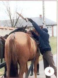 .4- On lance les guides sur le garrot du cheval de gauche.