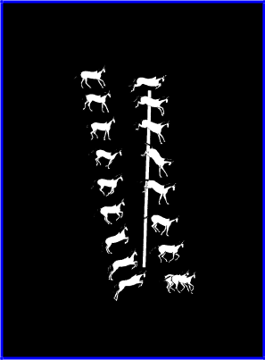 BD239 Analyse verticale d’un saut technique, obstacle de 1 m de haut. La colonne de gauche (chevaux de 1 à 9) montre le cheval avant l’obstacle, battue, montée. La colonne de droite (chevaux de 10 à 18) montre le cheval au-dessus de l’obstacle et après l’obstacle, planer, descente, réception, reprise du galop. L’analyse verticale permet de séparer les différentes phases du saut et de noter la progression de la masse du cheval au cours de ce saut et de la situer par rapport à l’obstacle. Le saut est effectué ici au galop à droite.