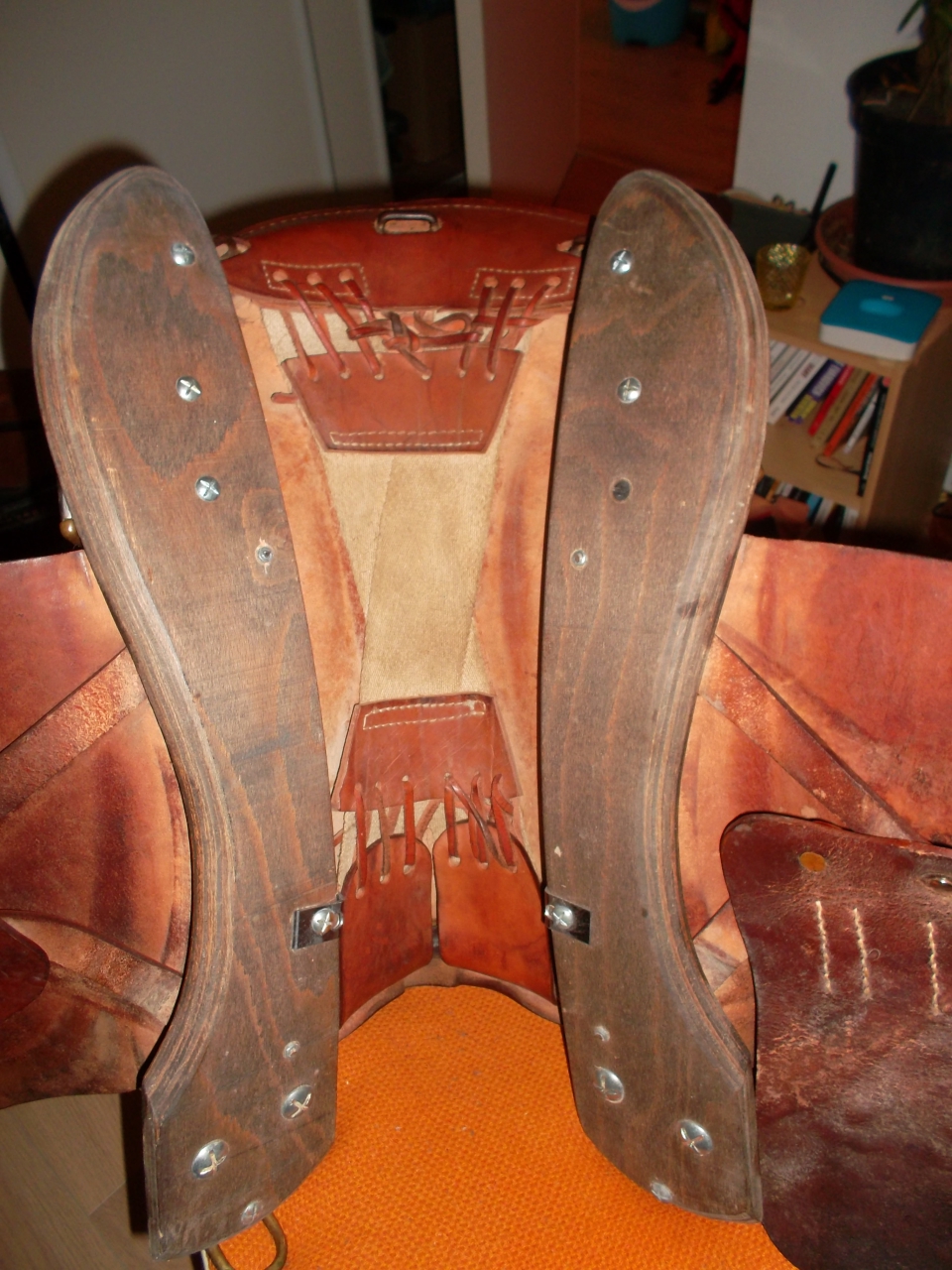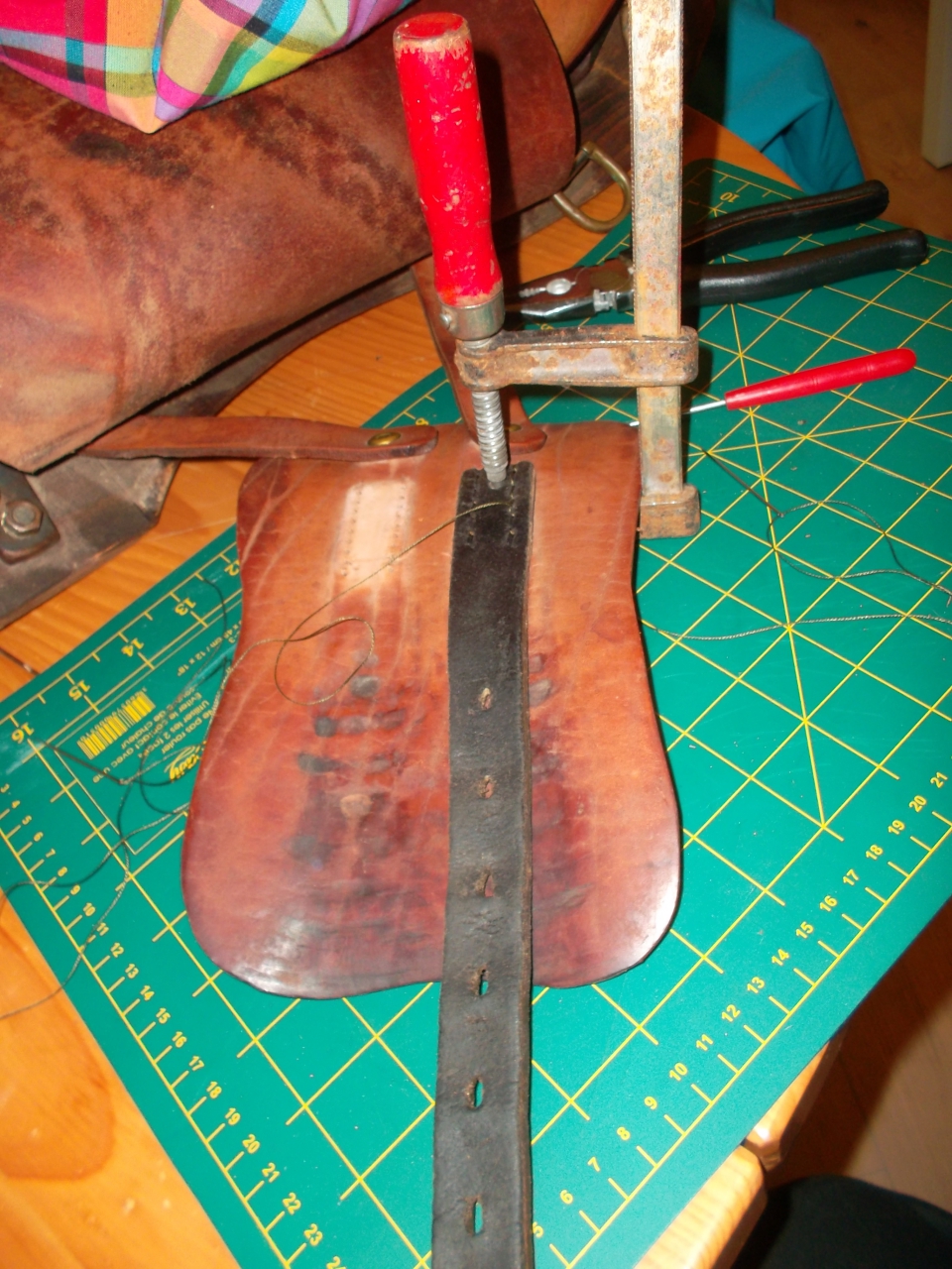| Dire merci | ensuite, j'ai commencé a demonter ma selle, en enlevant les protection des bates qui sont en feutre![]() ![]() ![]() j'ai decousu et jeté les vieux sanglons qui etaient fendillés ![]() j'ai coupé et limé l'excedent de tige des petites vis qui tiennent les quartiers, et qui depassaient un peu trop pour moi ![]() et couture des nouveaux sanglons (bon, ils sont noirs, mais pas grave... ![]() |