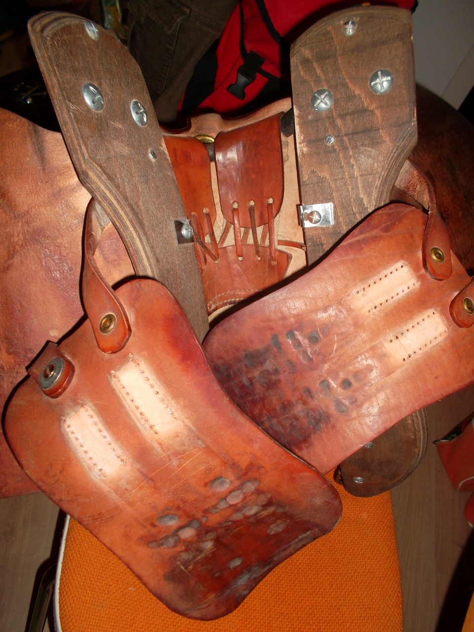 | Dire merci | alors, je suis au boulot sur la selle d'arme que j'ai reçue, mais pas grand chose a faire, elle est en tres bon état... j'ai commencé par me faire des manchons pour proteger les boucles de mes etrivieres dressage et tenir le surplus d'etrivière... (pas clair...) ![]() ![]() |