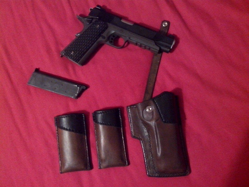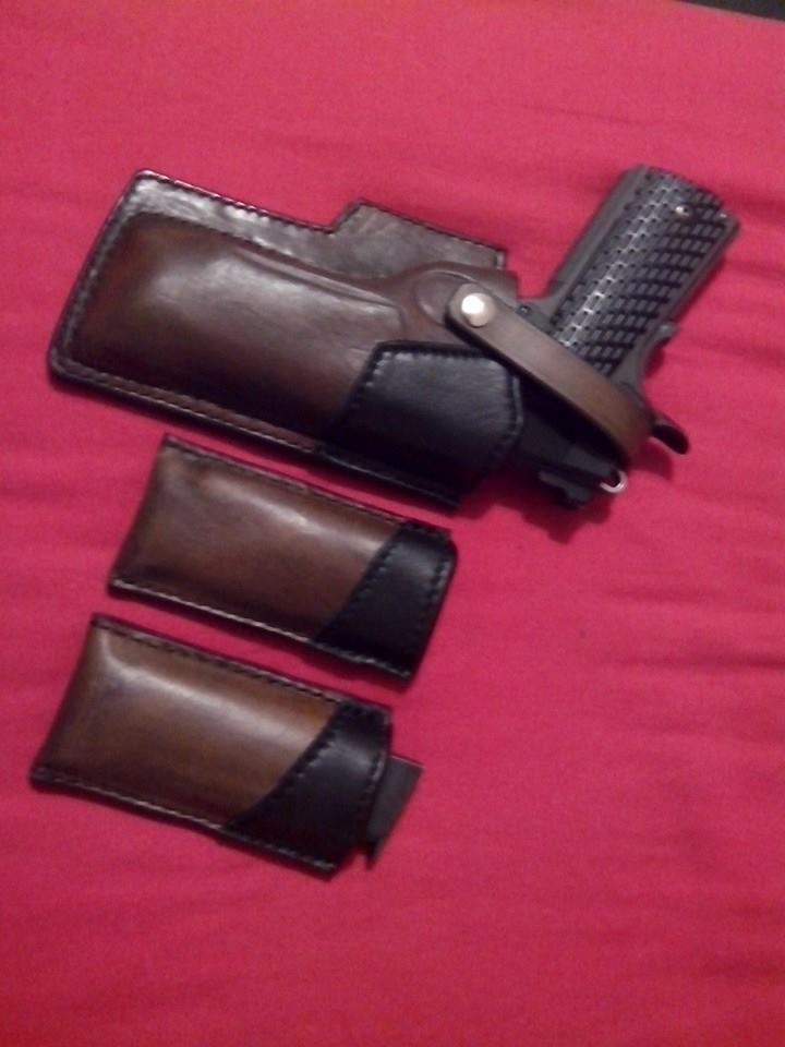 | Dire merci | bon bah modeste participation du jour, un side.![]() ![]() ![]() ![]() et pour changer tout a fait de registre, un holster + pochette chargeur pour la réplique de mon copain (désolée pour la qualité des photos)![]() ![]() |