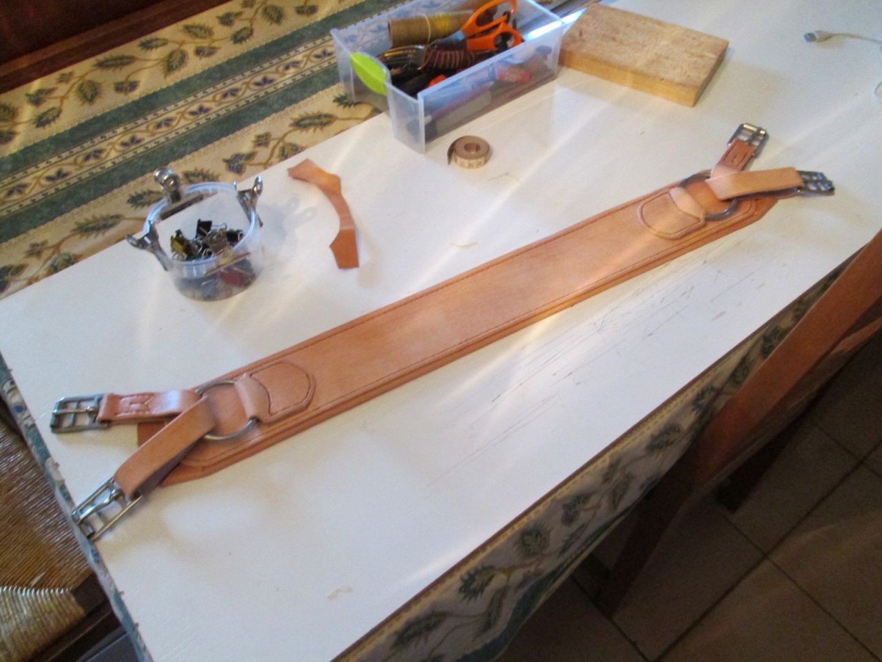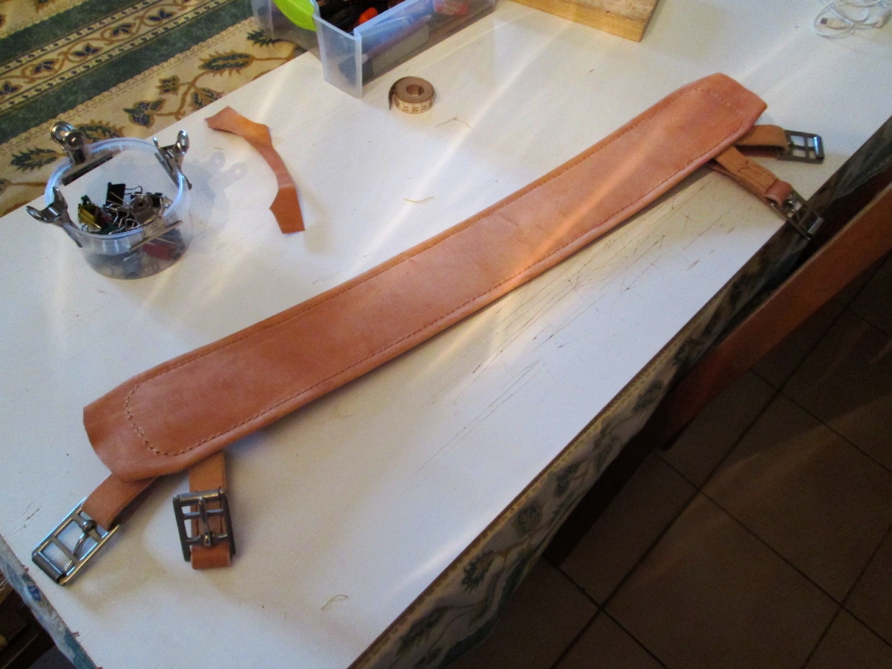 | Dire merci | Des news de la formation. J'ai bien commencé ma ceinture, le cuir est couper et les finitions faites. Reste plus qu'à faire les trous et coudre la boucle. |