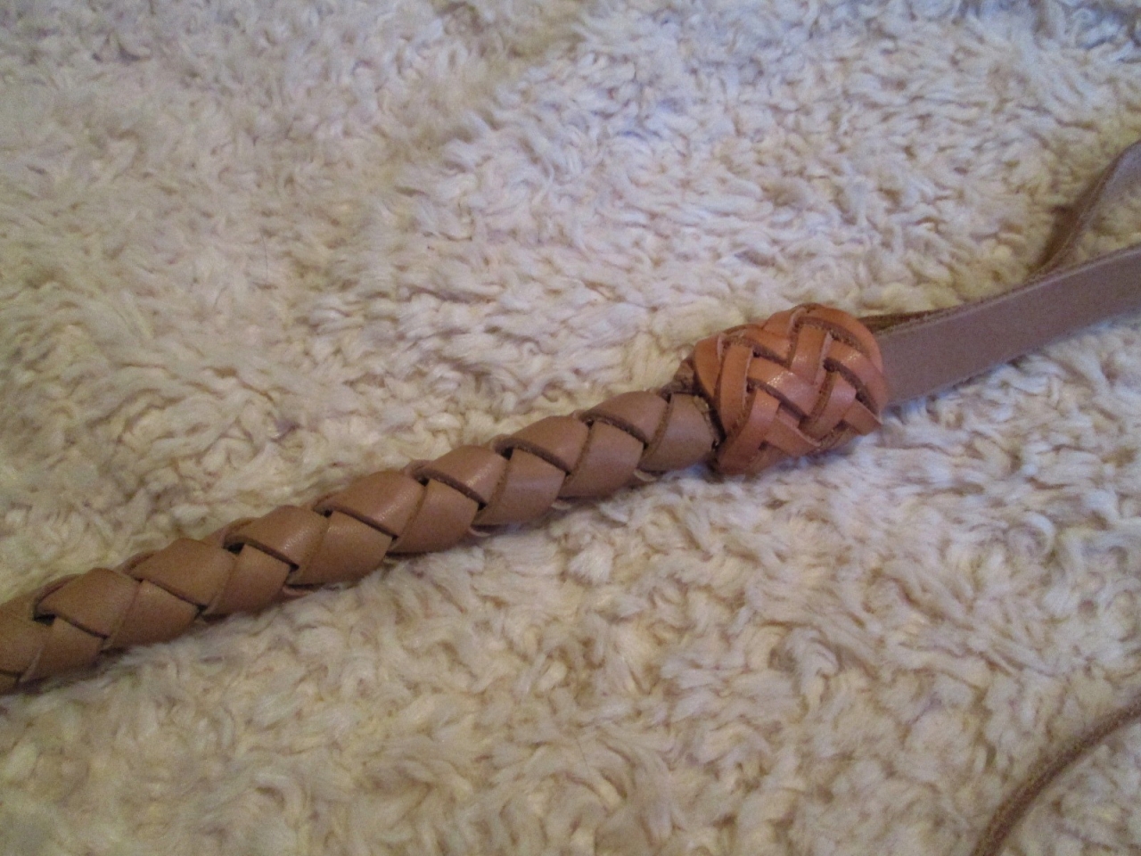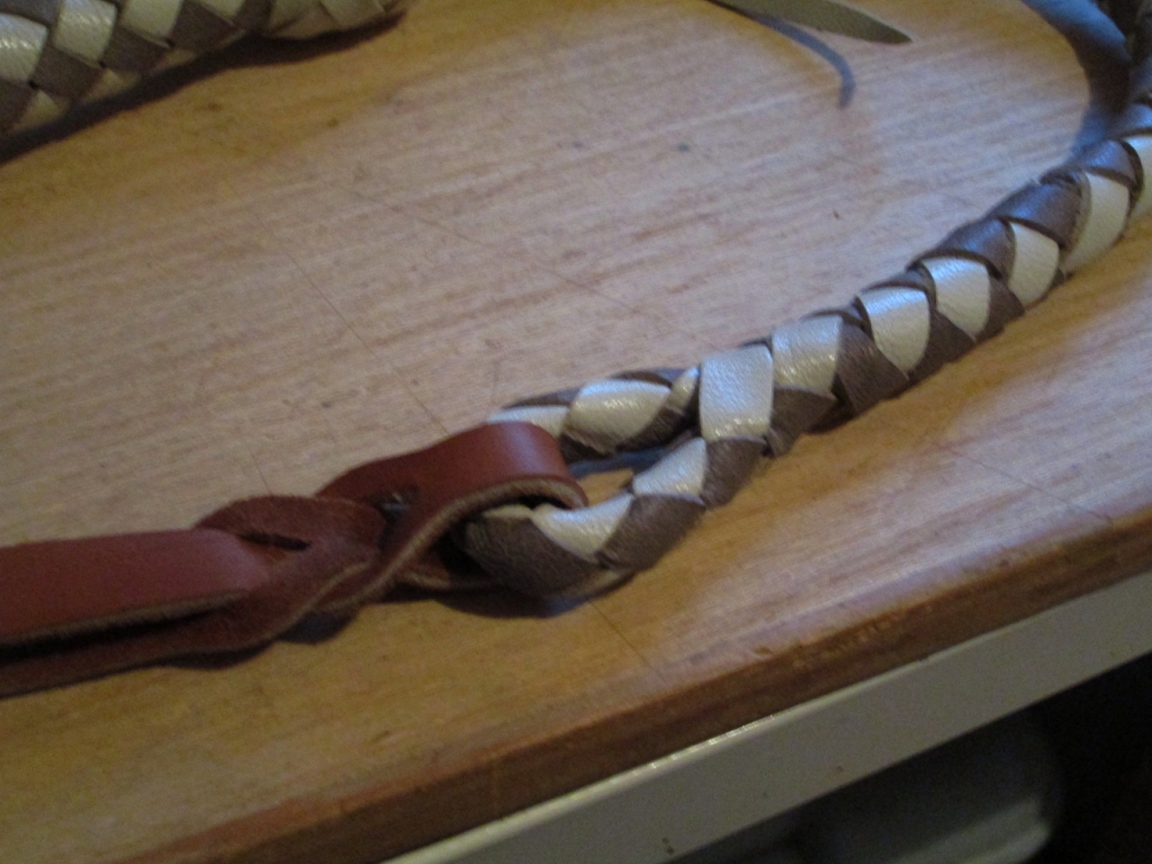 | Dire merci | Merci tout plein Papyrus et Quercy. Mon bridon avance doucement mais sûrement. Je l'avais mis de côté cette semaine, j'ai réparé un caveçon pour une amie. Alors, il manque encore les montants du mors, mais il commence à prendre forme. J'ai attaché la sous gorge sur le frontal de sorte à ce qu'elle ne passe pas sur la nuque: |