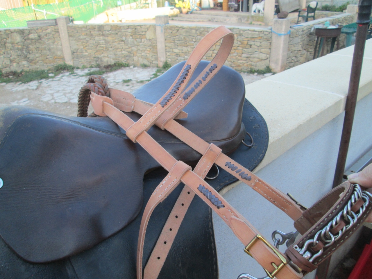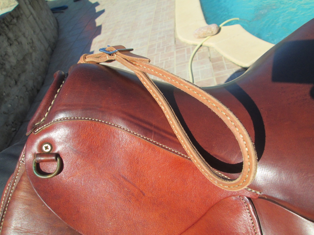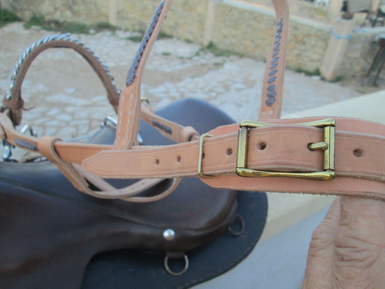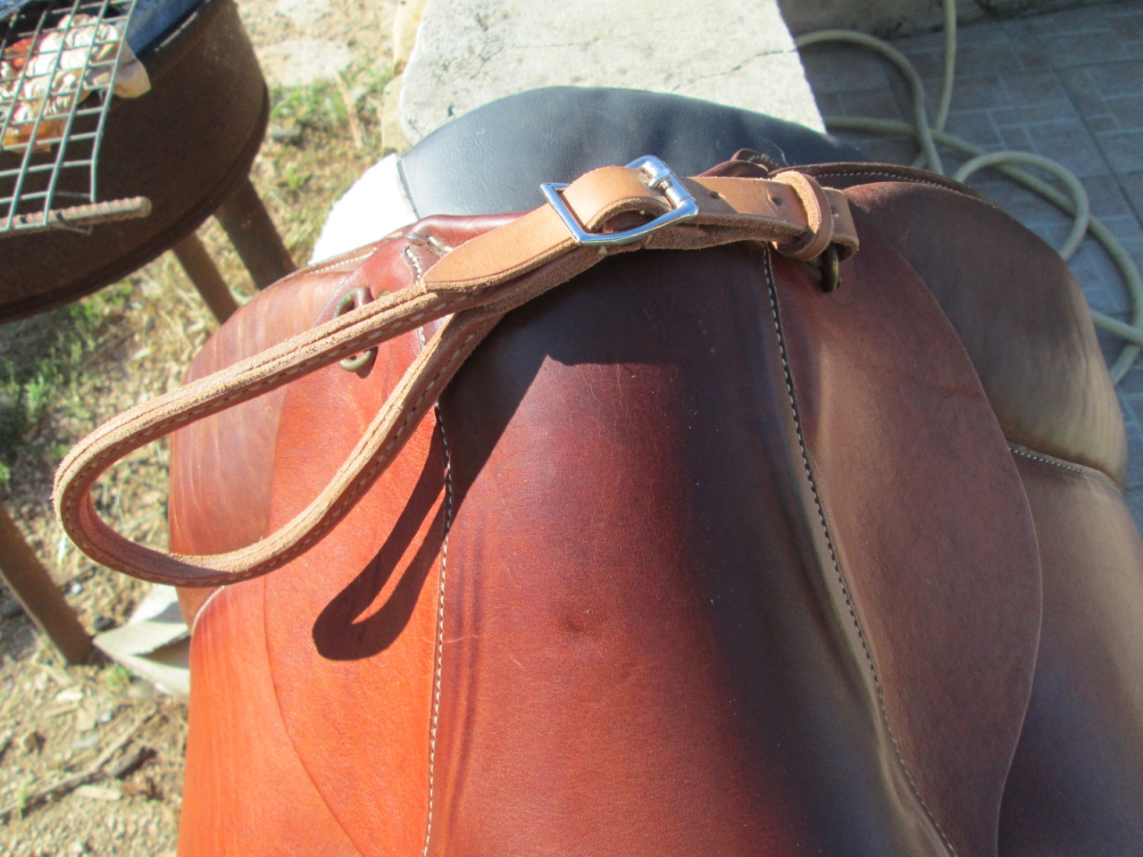 | Dire merci1 | quercy Si tu te fait une poignée de monte, il vaut mieux avoir un cuir assez solide pour ne pas casser au moment où tu tires dessus pour monter en selle. J'ai doublé mon cuir au niveau de la poignée et je l'ai cousue |