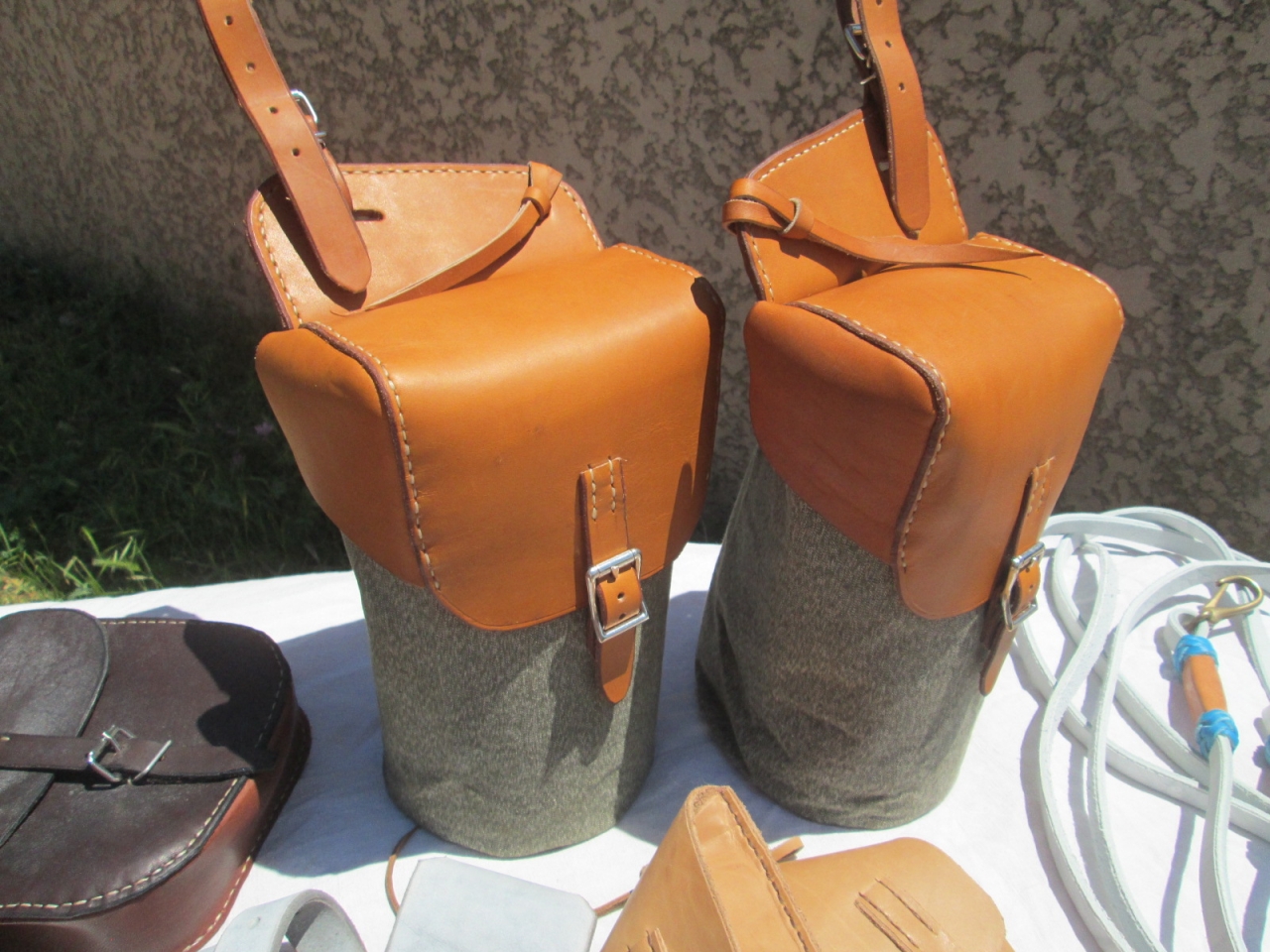 | Dire merci | Petites créations récentes…. Fontes en cuir et toile de jute de l'armée Suisse. Capacité 2L environ ![]() Petites sacoches a fixer sur les anneaux de la selle quand on a pas de tapis a poches. ![]() Rênes en cuir avec mousquetons laiton ![]() |