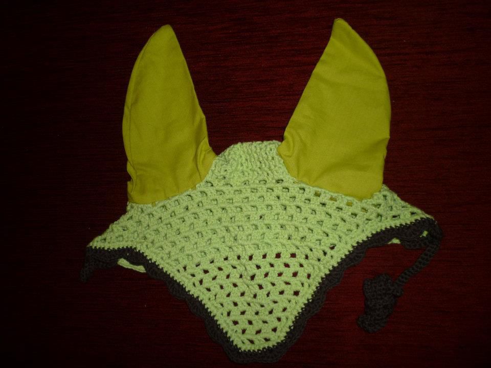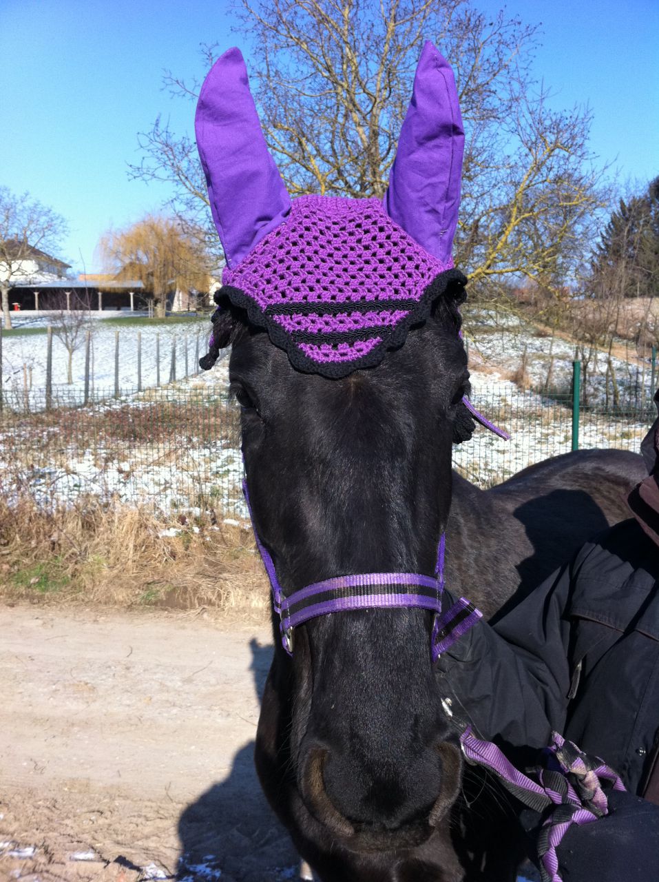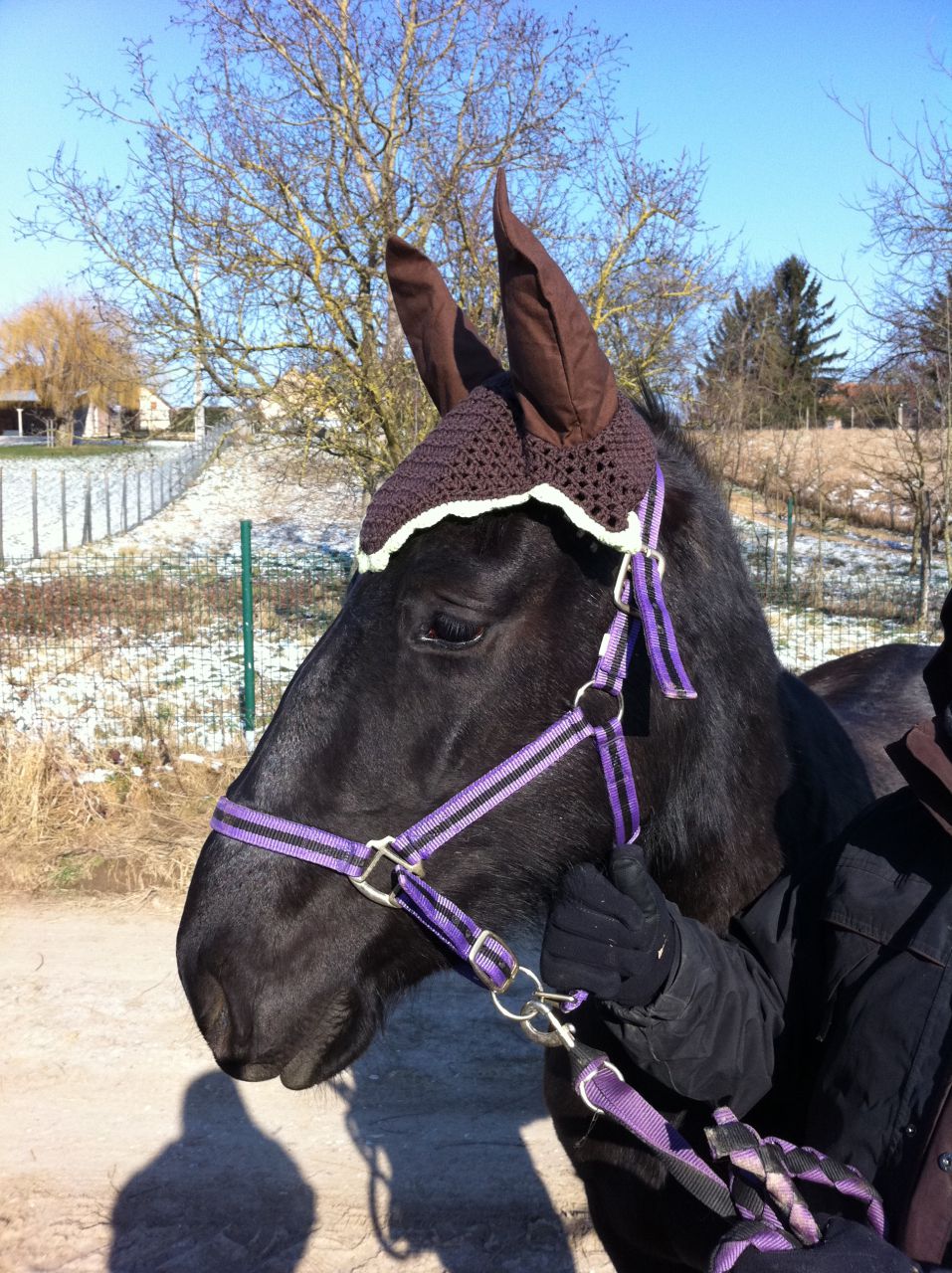 DéconnectéDire merci | Ce n'est pas un privilege du sud car j'habite dans le nord est et en été nous avons pas mal de petits moucherons ou moustique. Donc plutot que le cheval secoue sa tete sans arrets et vous assome presque d'un coup de boule, moi je prefere lui mettre un bonnet anti-mouche. Et comme ils sont faits maison je choisis mes couleurs et j'assorti avec mes tapis |