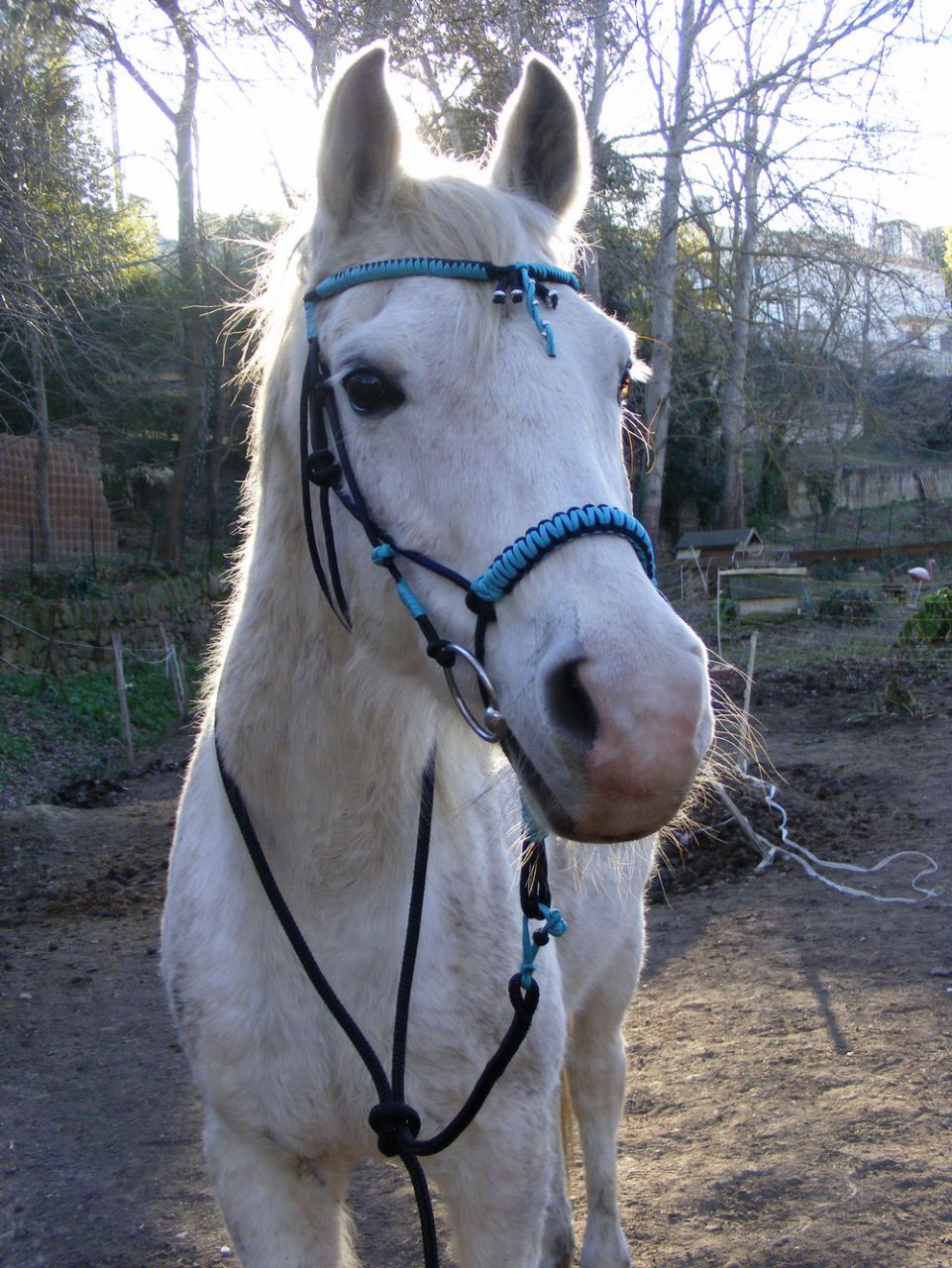 | Dire merci | Pour ton bridon en corde,tu peux combiner avec du cuir:![]() Ou mettre une plaque de cuir sous la têtière: ![]() On ne la voit pas bien... |