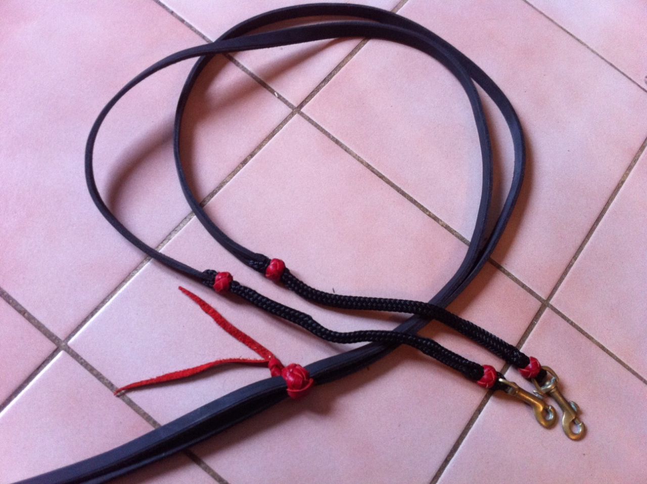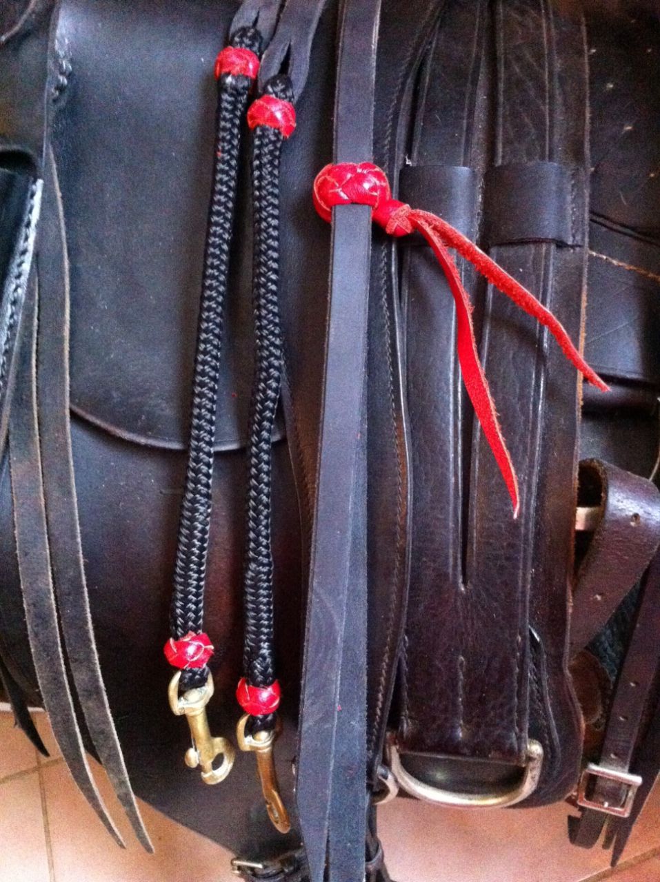 | Dire merci | Une paire de rênes en cuir et en corde...Le rouge est moins "flashi" en réalité ![]() ![]() |