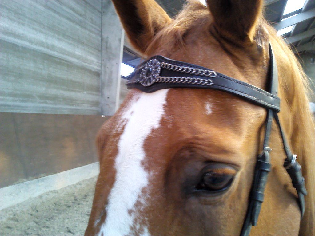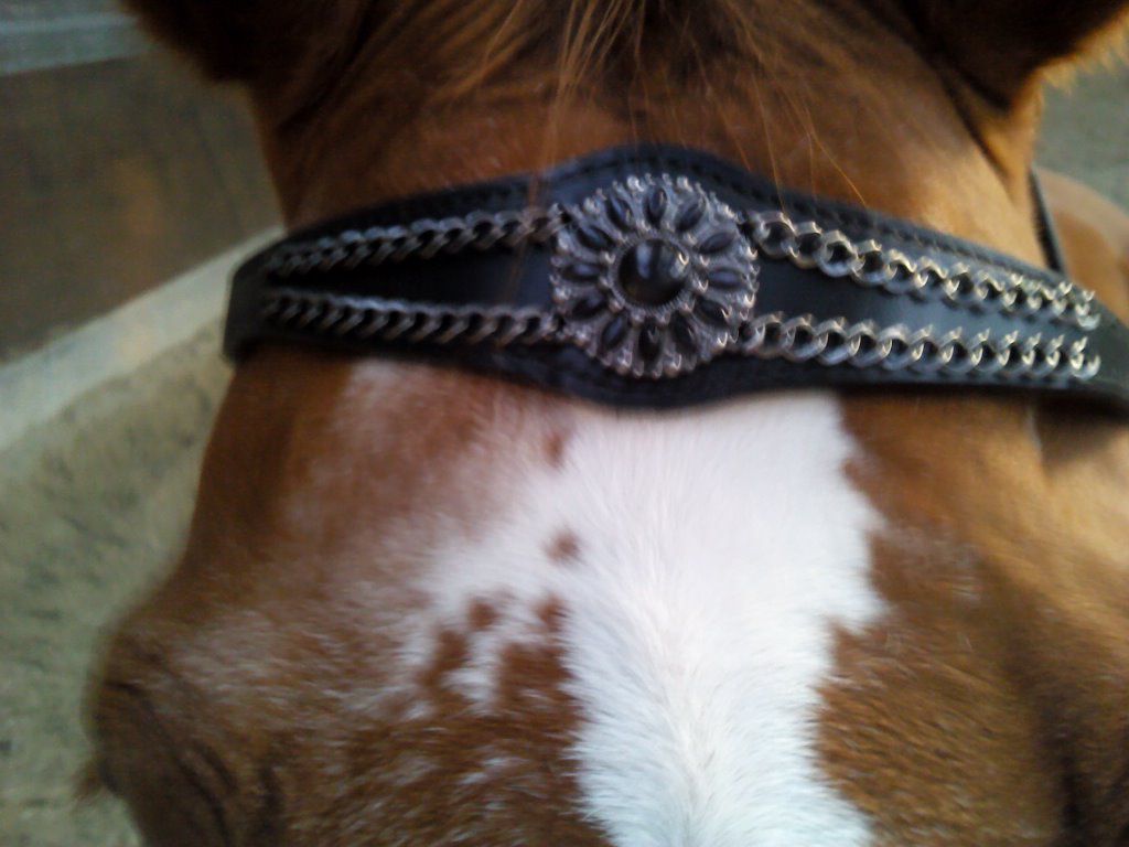 | Dire merci | Le frontal et ma muserolle oui le reste à la main. Là c'est le cadeau de noël de mes soeurs, donc il y a encore des choses à améliorer à mon goût sur mes modèles, mais je suis quand même contente du résultat. Oui les points font jolis je trouve à la machine aussi. Par contre j'ai passé le la tranche du licol cto clair et je pense qu'il aurait fallut une couche ou deux de plus pour faire mieux fini. |