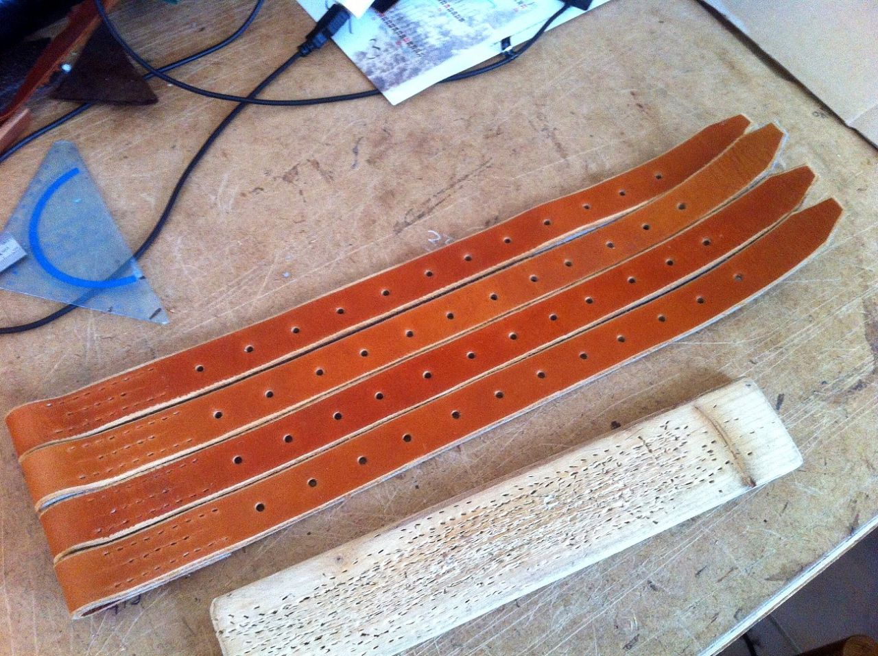 | Dire merci | et un habillage pour ne pas choquer les gens habitués aux produits manufacturés..(et pour empécher le bruit de cloche quand les étrier se choc); j'ai ajouté un plancher cuir épais (tremper dans l'eau chaude pour donner la forme, lacer) ..le tour est joué. |