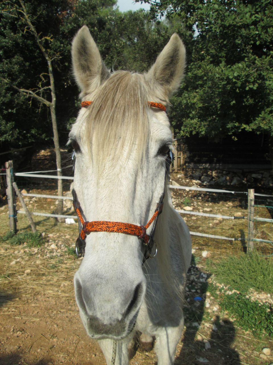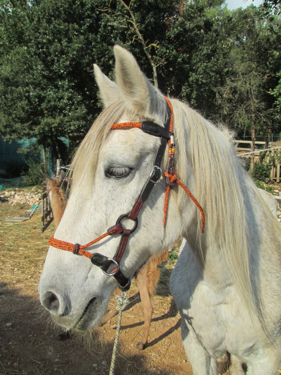 | Dire merci | Ben moi je m'en vais teindre et coudre, j'ai une sale crève et les yeux qui piquent, il a neigé hier à 1500/1600, du coup pluie froide en bas, bref. C'est mon fameux bridon camarguais avec muserolle à l'anglaise! |