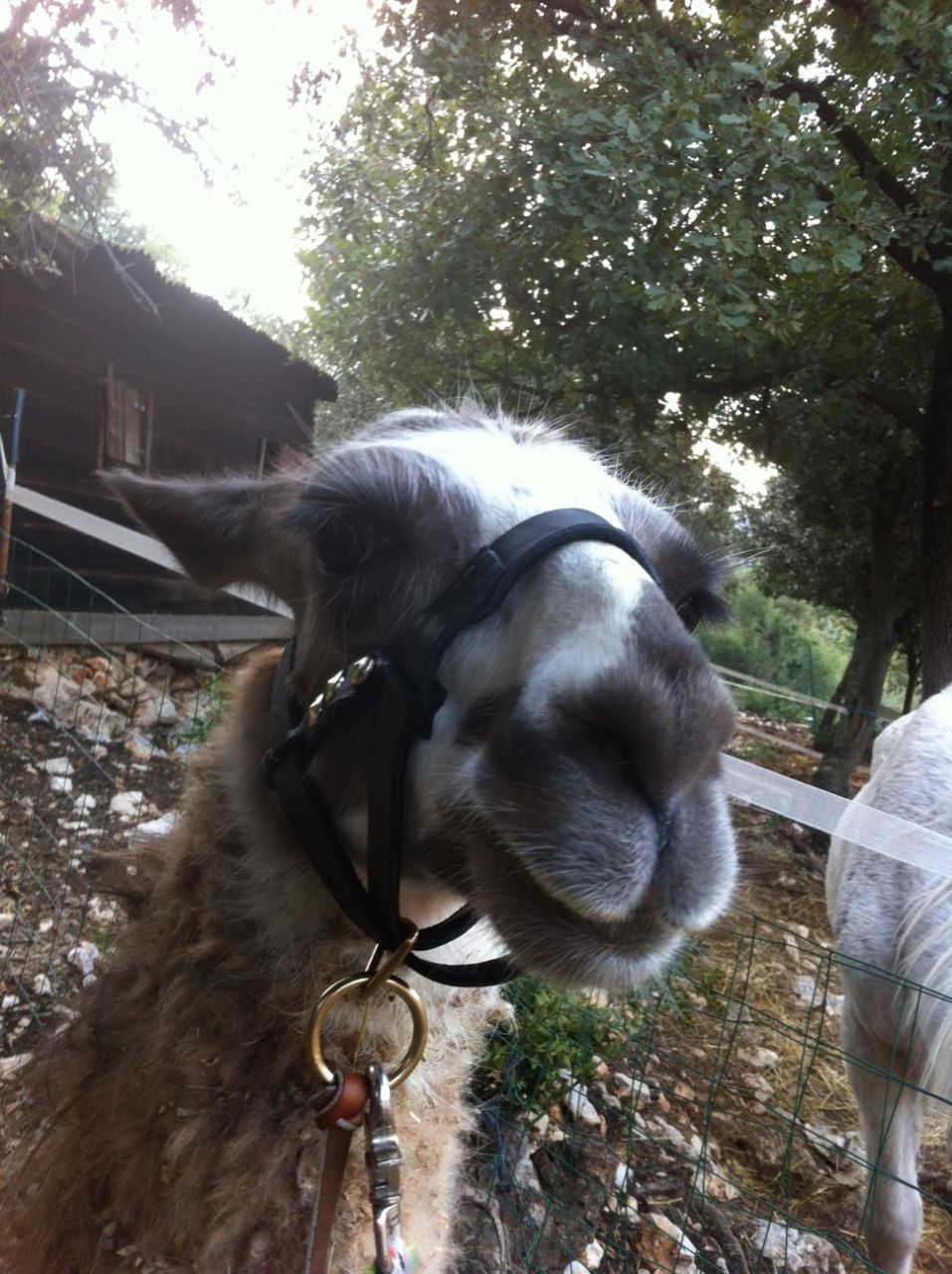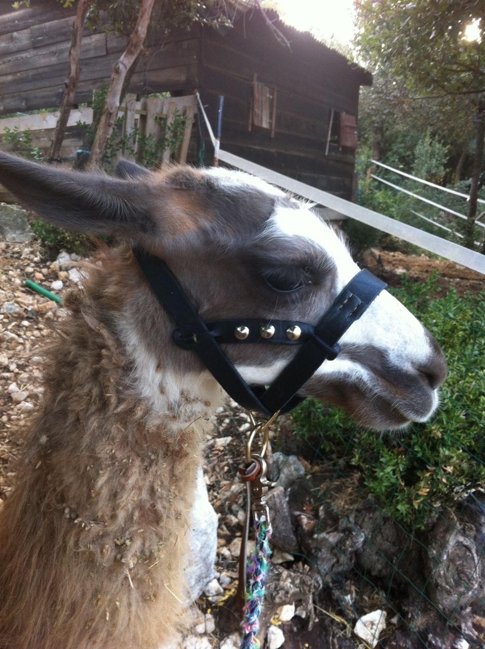 | Dire merci | Un licol solide pour attacher Nell au piquet: (a la mode) ![]() Règle n°1 ne pas déranger le lama au repas sous peine de menaces de ce genre: ![]() Vraiment pas aimable la bête le matin! |