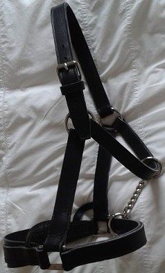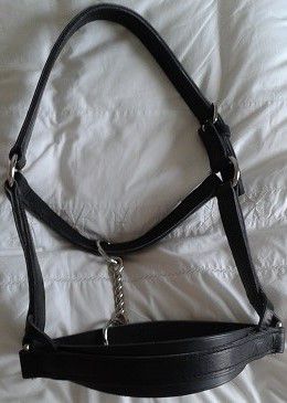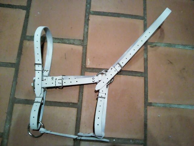 | Dire merci | magb temps qu'il n'y a pas de pub tu peux poster tes créas, on adore ca Petite note concernant le licol reglable de partout : Boucles a chape (peuvent se riveté, peu cher) cuir chromé blanc affiné (4mm a 3mm pour les retours) Rivets anneau soudé (moins cher que du fondu) carré d'un vieux licol 1h30 de boulot (juste abbat care et affiné en finition) Tout ca pour dire qu'il est inutilisable pour attacher un cheval. cela a bel et bien pour but uniquement la prise de mesure je vais faire idem pour les sides, surtout pour les sides (mais avec des boucles a chape double et noire, et du cuir noire ) |