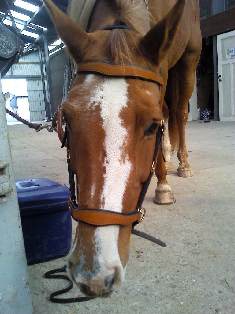 | Dire merci | Mes fils sont arrivés ce matin (pourquoi ils arrivent tous quand je suis en pyjama? )Pour faire joujou et céder à une envie que j'ai depuis longtemps, j'ai retiré la boucle sur ma muserolle combinée pour la changer en muserolle française. Par contre ça fait un vilain trou maintenant. C'est un cuir marron simple, doublé blanc. Je sais pas trop comment le coudre, juste au "trou" ou bien je refais tout? Par contre je vois qu'il y a deux fils de couture : un blanc juste pour la doublure et un brun pour le dessus, mais aucun ne paraît du côté opposé... Je l'ai depuis très longtemps et le fil est sale j'ai jamais pu bien le laver, donc peut-être que c'est le même fil? Perso je ne l'utilise plus (je ne peux plus monter faute de finance, les moniteurs ne sont pas toujours d'accord et je préfère monter sans muserolle). Est-ce que je peux tenter l'opération chirugicale? ![]() |