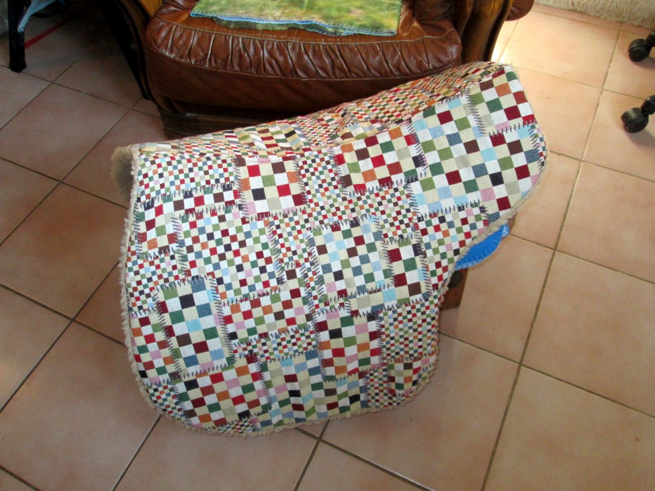 | Dire merci | J'ai osé!!!! Mon premier tapis,sur-mesure pour ma marathippo La victime,un tapis rando de décathlon ![]() Et voilà le résultat...très tendance! ![]() ![]() ![]() |