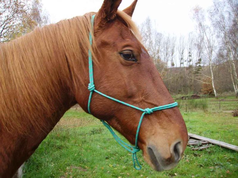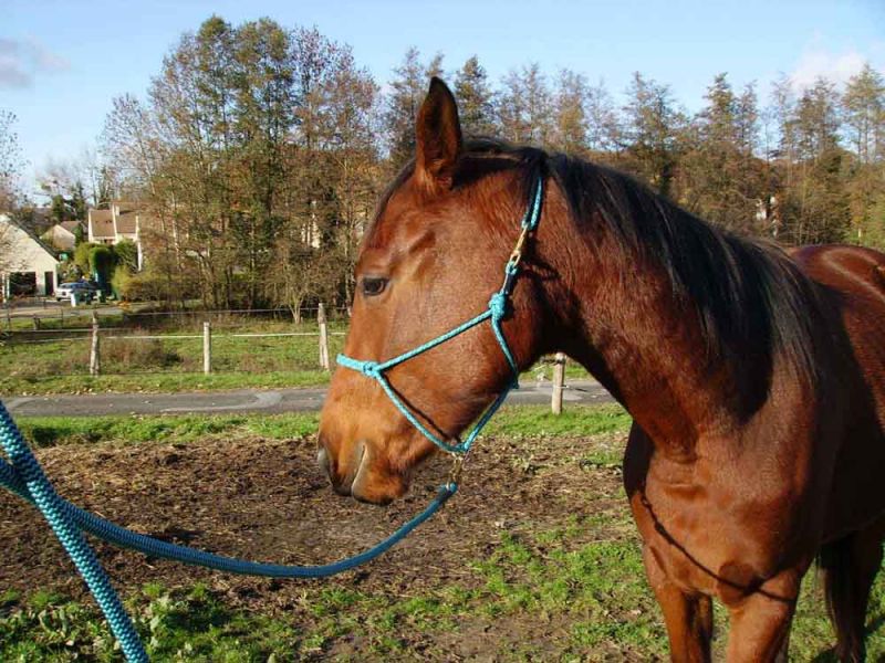 | Dire merci | Oui moi j'avais trouvé un autre site ... J'en ai refait depuis, avec seulement 5 m ca marche, et ma jument a une tête énorme ! Pour celui la c'est un poulain donc je le voulais pas trop sévère c'est pour ca que le noeud est assez haut |