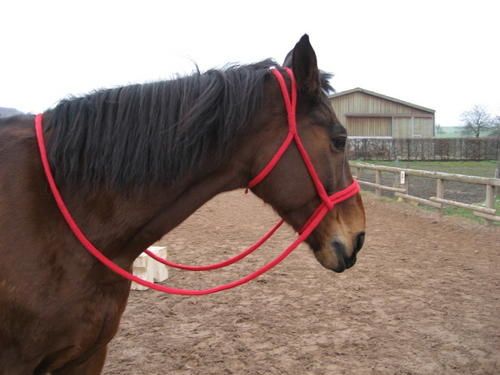 Déconnecté | Je prend de la corde d'escalade 10mm environ. Des mousquetons pas trop lourds pour ne pas que ça brasse trop la bouche du cheval. J'ai 4m de rênes mais je fais un noeud car un peu long. 4m car si j'ai besoin d'une corde pour attacher mon cheval je l'ai sous la main! Pour l'instant je tatonne pour trouver un noeud qui ne soit pas trop volumineux (car aie la bouche si c'est trop gros et donc torp lourd) et qui tienne. |
