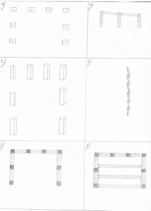 Déconnecté | Abri de prairie de 3 m. 80 x 3 m. couvert de 3 côtés Etes-vous bricoleur ? Si oui, voilà ce qu'il vous faut pour construire l'abri de votre cheval. Je sais qu'il reviendra certainement moins cher que ceux mis dans le site, qui sont certes très bien, mais celui-ci peut être fait à moindre prix en 2 ou 3 jours par un bon bricoleur. Le site Cheval Matériaux * environ 600 kg. de béton. * 4 piliers 23/8 => 2 m. 60 * 2 piliers 23/8 => 2 m. 80 * 2 piliers 23/8 => 3 m. * 2 poutrelles 18/7 => 3 m. * 2 poutrelles 18/7 => 4 m. * 30 voliges 3/4 => 4 m. * 60 voliges 3/4 => 3 m. * 20 sabots pour 18/7 * 5 kg de pointes 65 mm. * 8 barres à béton diamètre 1.5 mm. => 45 cm. * 12 tôles asbesse ciment 1 m. 22 * tire-fond (110 mm.) + coupelle * 1x braquets. * 1 marteau de charpentier. * 1 niveau. * 1 pelle. * 1 seau. * 1 truelle. * 1 clé à douille diamètre 13 mm. * 1 foreuse. * 1 mèche à bois diamètre 16 mm. * 1 mètre. * 1 crayon. * 1 ficelle de maçon. * 1 scie circulaire. 1ère étape Creuser 8 trous (40 cm. x 40 cm. x 40 cm.). Y couler du béton (fondations). Y placer les barres à béton verticalement en les laissant sortir de 15 cm. environ du sol. 2ème étape Quand le béton est sec, placer les piliers (forer des trous dans le pied pour les introduire sur les barres à béton) en veillant à ce qu'ils ne touchent le sol, donc, s'emboitent bien sur les barres. Placer les 4 de 2 m. 60 au fond (point bas). Placer les 2 de 2 m. 80 au milieu. Placer les 2 de 3 m. au point haut. Tendre une ficelle du dessus des piliers du point bas de façon à les mettre de niveau. Recouper ceux qui dépassent pour qu'ils soient tous à la même hauteur. Lorsque c'est fait, mettre les deux piliers point haut à même niveau, ensuite, placer les poutrelles entre les piliers où seront fixés avant les sabots métalliques (placer les poutrelles dans les sabots). Pour se faire, coupez-les à bonne taille (dessin 3), ensuite, recouper les deux piliers des côtés (dessin 4) pour qu'ils suivent la pente. |