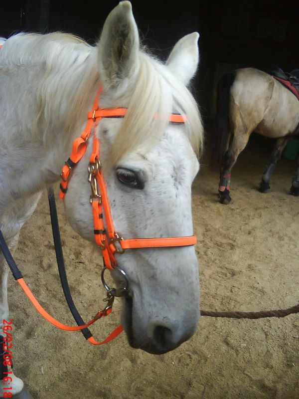 | Dire merci | Oui pourquoi pas...mais je veux pas que ça soit trop flash non plus Le gris, je t'accorde que c'est pas énormément plus gai mais ça fait moins classique et un peu plus lumineux. Une manière d'apporter subtilement un peu de classe aux allures quelque peu atypique de mon fidel destrier Je l'aime bien ce gris un peu argent il lui va super bien...pis d'avoir trouvé une bonne couleur en taille cheval de trait c'était pas mal quand même Sinon j'ai le classique licol en cuir blanc de présentation^^ |