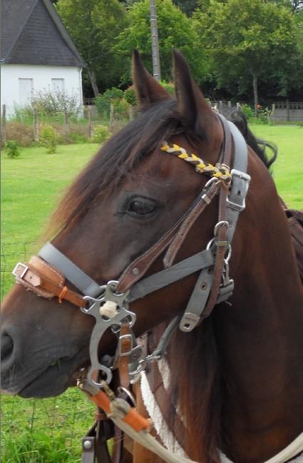 | Dire merci | Je suis allée acheter un bridon pour ma juju samedi (suite à la perte / vol du précédent) et le frontal est un peu grand. Hormis le fait de l'enmener chez le cordonnier, j'aimerais savoir s'il vous est arrivé de confectionner un frontal sur mesure ?????? Si oui, j'aimerais bien voir quelques réalisations pour me donner des idées. Il faut dire que ma juju est une arabe x poney d'1m40 et donc avec une tête fine. La taille cob lui va sauf le frontal. La taille poney aurait été trop petite. Merci à vous pour vos photos et commentaires ![]() |