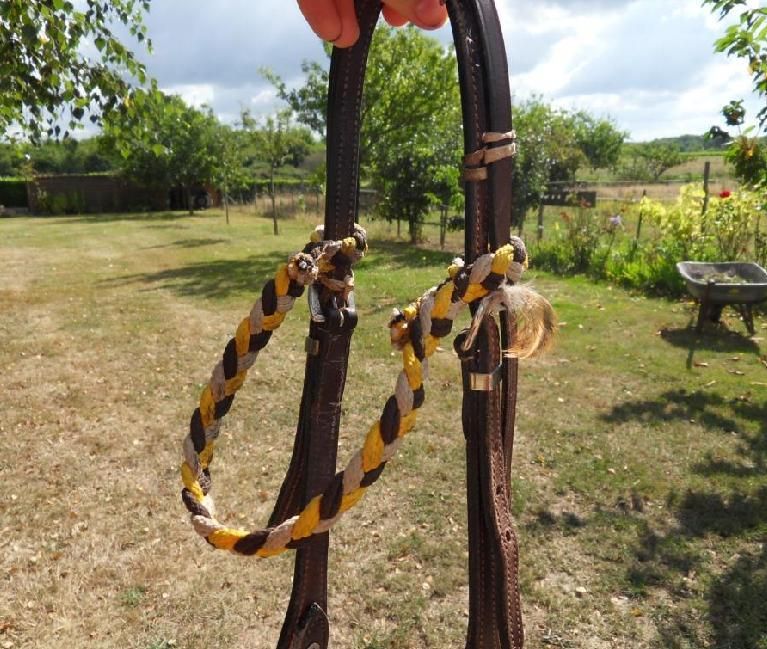 | Dire merci | j'étais dans la meme situation; j'ai acheté un filet western (don taille cheval) pour mon poney. Les montants allaient très bien mais le frontal était dix fois trop grand. Il est resté au placard pdt un moment, mais je trouvais ça dommage. J'ai décidé de faire un frontal moi meme, en m'inspirant du filet de chez barefoot avec un frontal tressé. Dans un magasin de tissu, etc... j'ai acheté des bouts de "corde" de trois couleurs. Je les ai tressé puis cousu sur mon filet (chui pas super douée en couture, mais ça tient !) voilà le résultat : ![]() ![]() sur karel (désolée la photo est pas très bonne) ![]() ![]() |