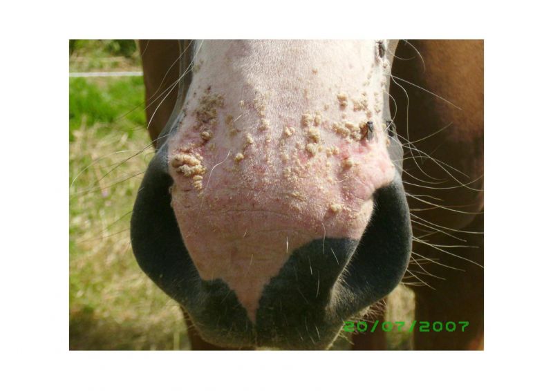| Dire merci | pour ma part, les "verrues" sur le nez étaient des croutes suite à des coups de soleil... C'était une des hypothèse de départ, mais tout le monde hésitait: véto, moi, copine de cheval... Aujourd'hui je pense qu'on peut dire que c'est confirmé puisque ça ressemble en moins important à ce qu'elle me fait sur les balzanes depuis 1 mois... donc le traitement c'est désinfection béta rouge, rinçage, séchage. Le véto m'avait donné en plus une pommade de cortisone et antibiotique sur quelques jours. et en plus un traitement de fond : drainage hépatique... Y a plus qu'à!!! en espérant que ça marche mais mon véto est pessimiste: "faut pas rever on la guerira pas" |