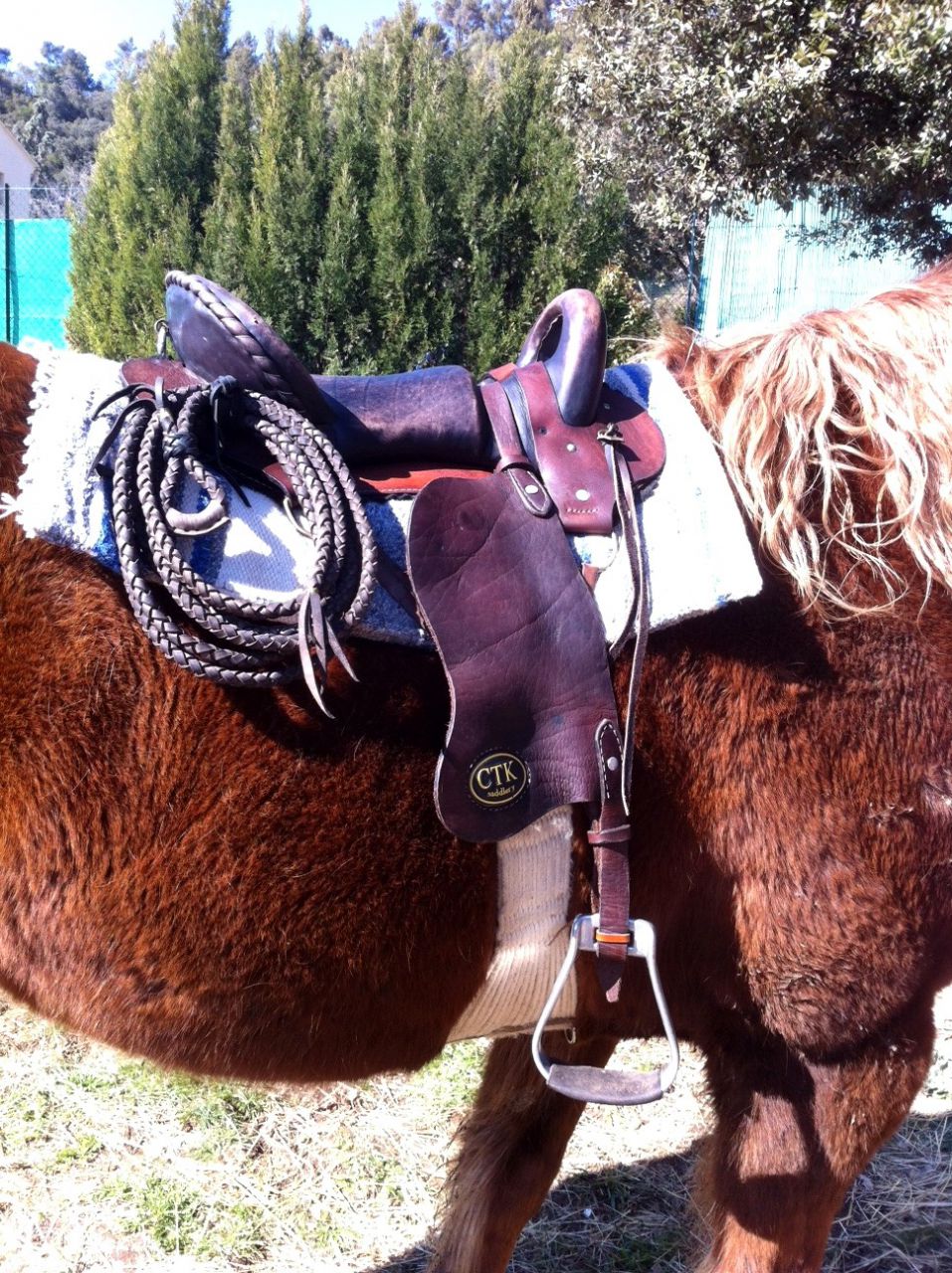 | Dire merci | Ma dernière arrivée,un vrai fauteuil! Un peu lourde,mais elle va comme un gant a mon cheval...alors qu demander de mieux! Avant: ![]() Après relookage: ![]() C'est ue selle Brésilienne de la région du pantanal,fabrication de serie sans trop de finitions |