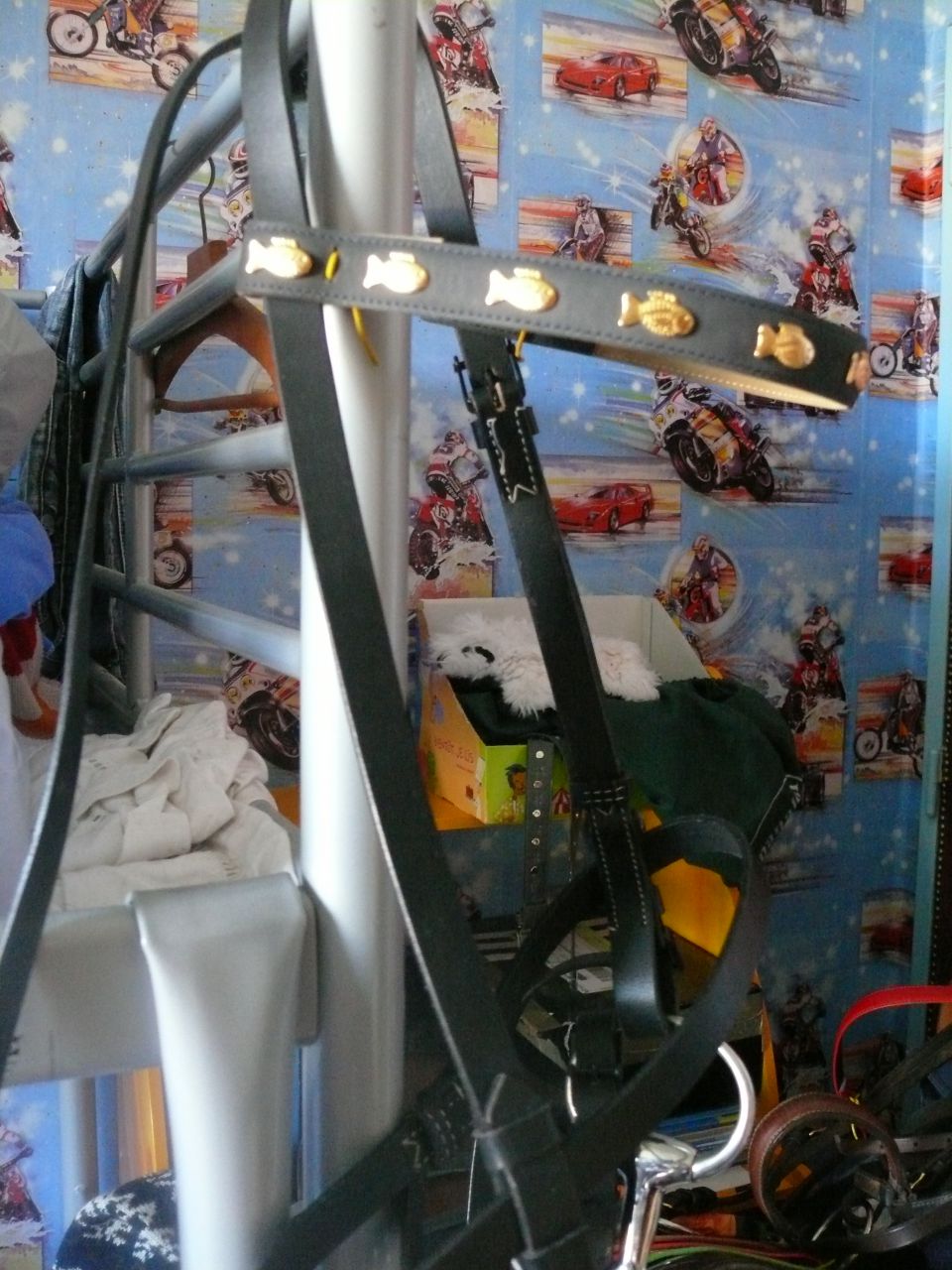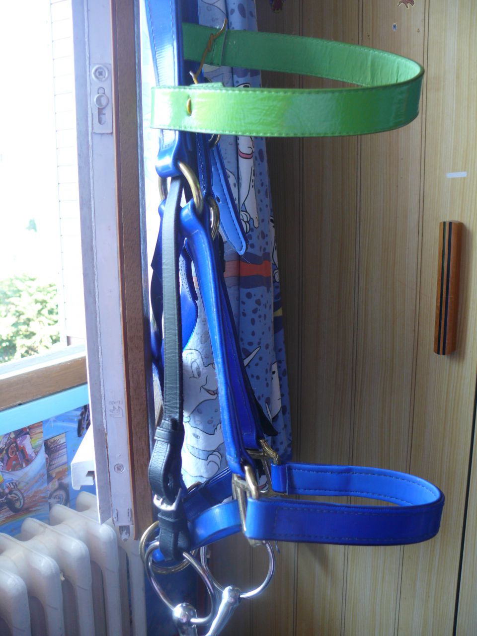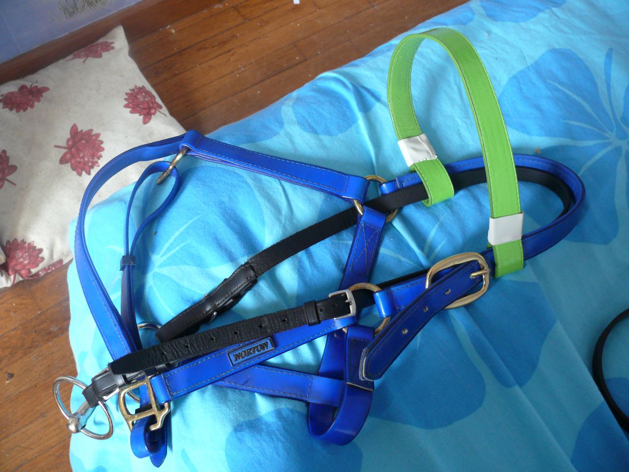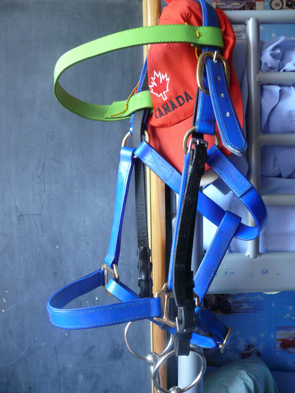| Dire merci | trés jolies tes boucles, ça m'intéresse ![]() pour faire tes montants, coupe une ceinture en longueur, passe des mousquetons dedans à chaque bout pour raccorder le premier à l'anneau de ton licol et le second au mors, ou juste un mousqueton pour le mors et coudre l'autre bout sur le licol ![]() |