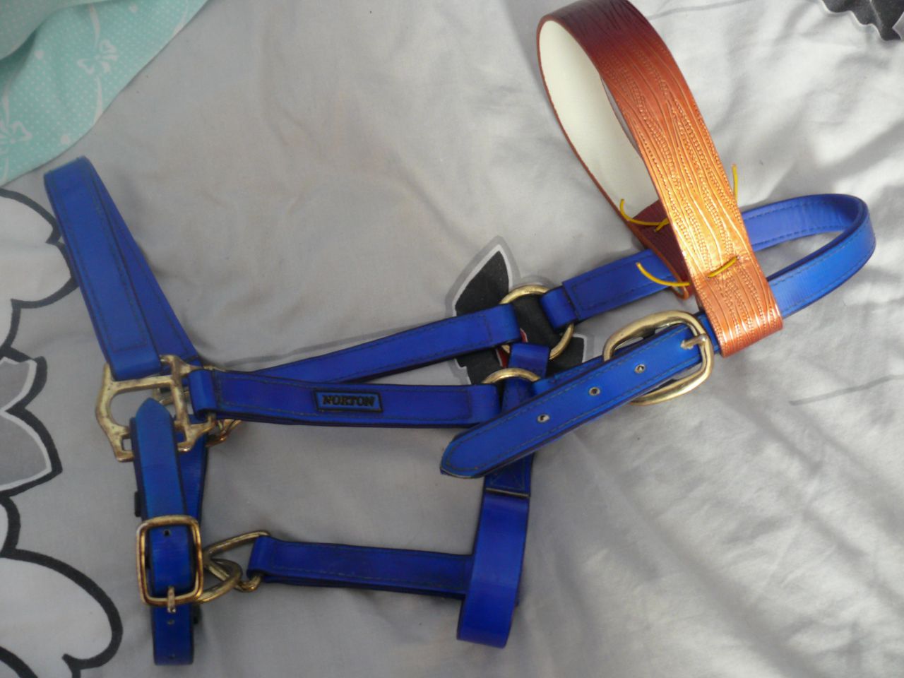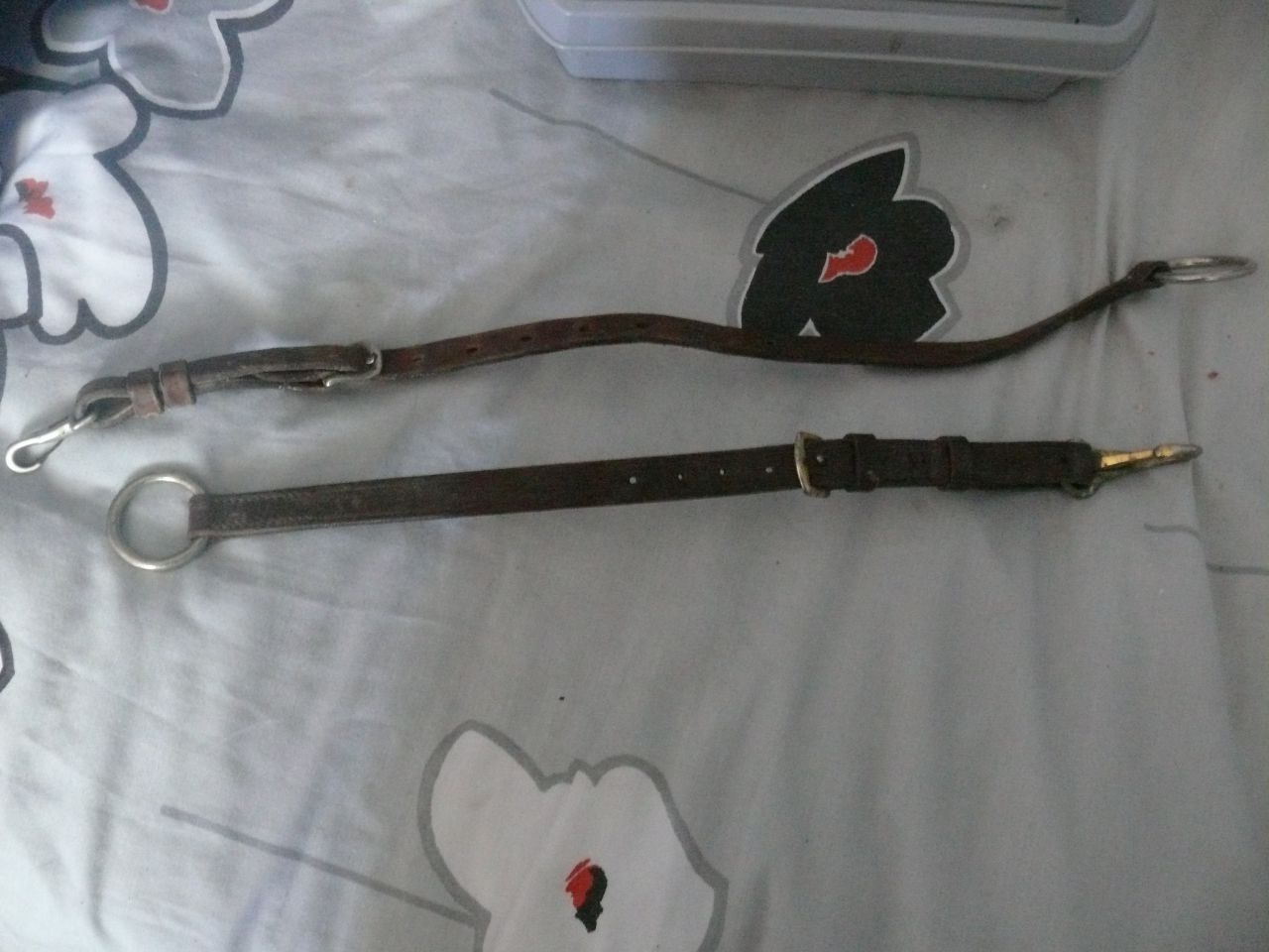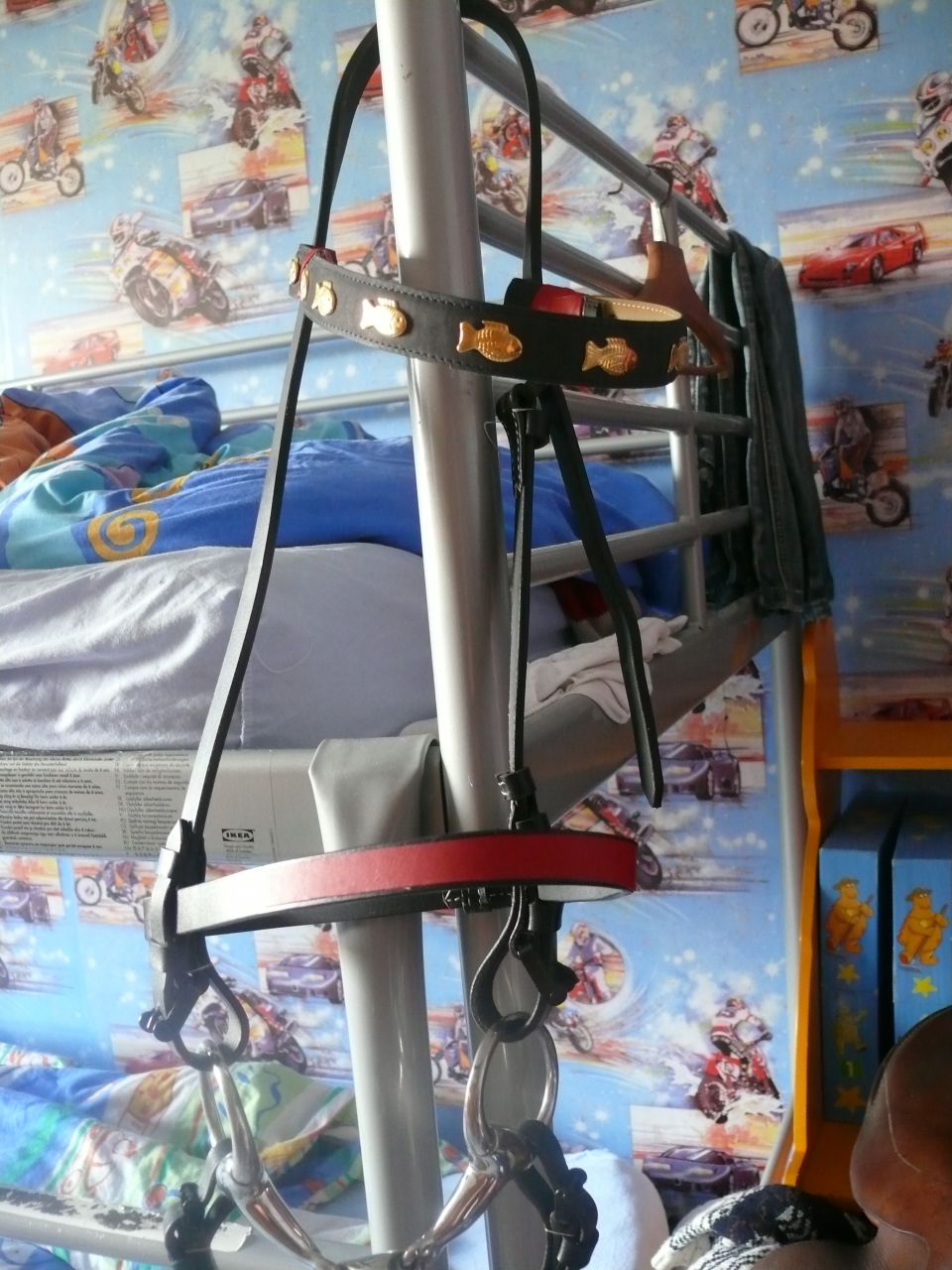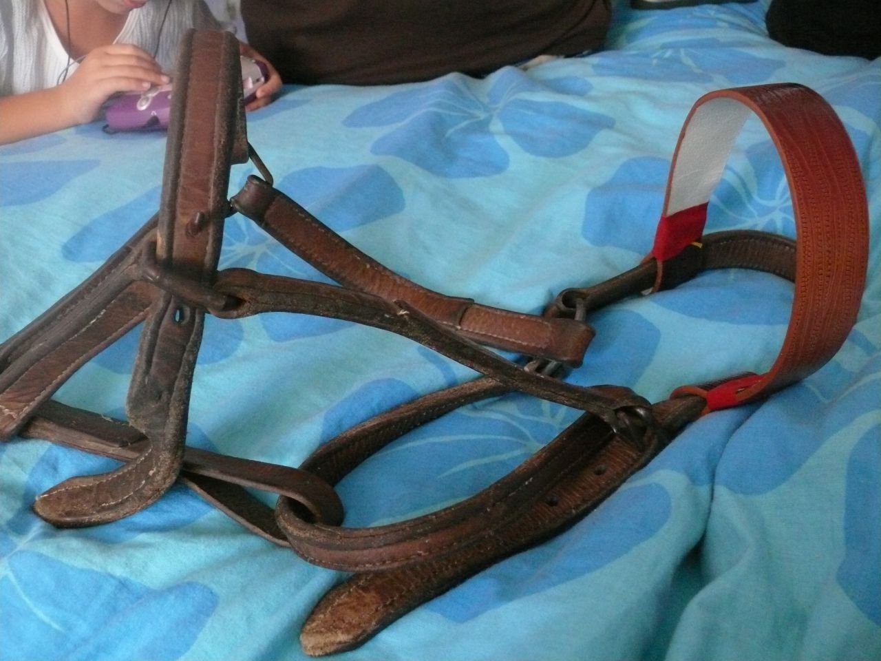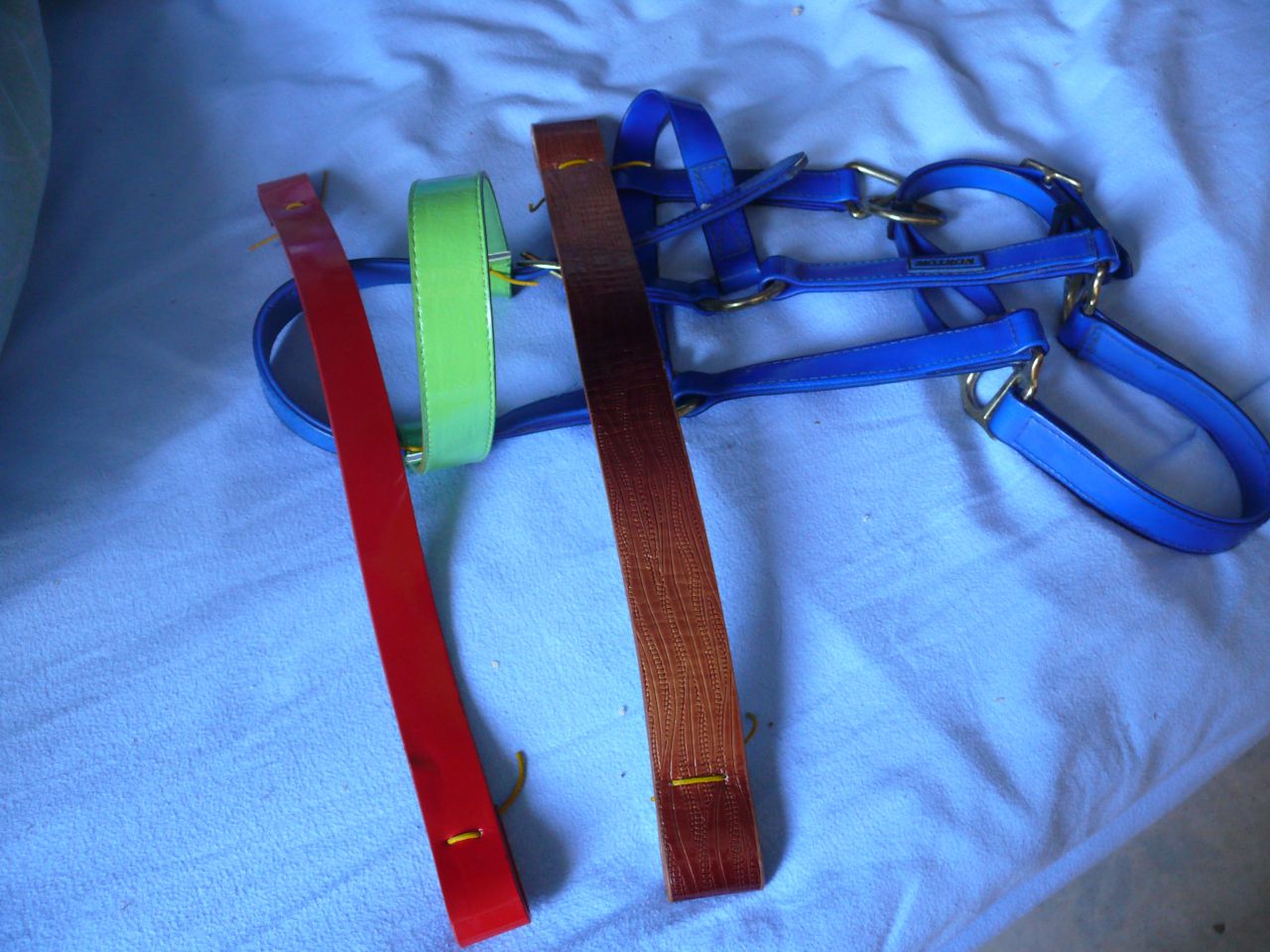 | Dire merci | trés jolies tes boucles, ça m'intéresse ![]() pour faire tes montants, coupe une ceinture en longueur, passe des mousquetons dedans à chaque bout pour raccorder le premier à l'anneau de ton licol et le second au mors, ou juste un mousqueton pour le mors et coudre l'autre bout sur le licol ![]() |