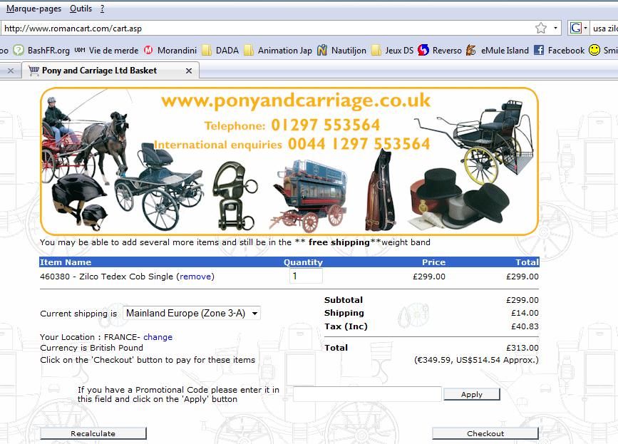 | Dire merci | Je viens de faire le devis sur le site du vendeur. Le harnais est un peu moins cher que dans la boutique ebay :![]() 313,00 GBP = 347,121 EUR Ca vaut le coup selon vous ? |