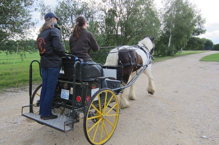 | Dire merci | Nous avons tourné un peu sur le payground, essayé d'avoir Thorgal bien incurvé/tenu, pas évident ^^ puis sommes allés faire le tour des paddocks individuels (= 1400m), avec du trot, c'était super ^^ j'ai eu pas mal de soucis de rectitude, encore une fois je suis beaucoup trop raide !! Et je n'utilise pas assez le fouet, dessuite je pense aux mains, mais pour beaucoup de choses c'est trop fort les mains, une simple caresse du fouet suffit... pour redresser... pis avec la petite manie de Thorgal de pencher à gauche, sur le retour j'ai un peu galéré, Guyonne l'a pris sur quelques dizaines de mètres pour faire des transitions, me montrer des trucs etc. Comme vous verrez sur la vidéo c'est un endroit où Thorgal n'est jamais très rassuré, là il nous a fiat un petit écart lol, le pire c'est que sur le coup je ne m'en suis pas rendue compte, j'ai découvert ça sur la vidéo... !! ![]() Enfin malgré ces soucis de rectitudes ça se passait très bien quand même ^^ j'ai repris mes guides, Joseph est monté et nous sommes allés refaire tous les 3 le tour des paddocks. ![]() Ca allait beaucoup mieux, j'étais un peu plus précise, Thorgal plus cadencé, plus droit. ![]() Nous avons fait une bonne petite pause pour discuter avec Andy qui passait par là et semblait enchanté par notre petite équipage ^^ et une étudiante et une proprio qui est venue montrer l'attelage à son cheval (pauvre cheval, on est toujours en train de le traumatiser avec nos conneries ).![]() Pendant toute cette pause Thorgal a été super, pas bougé d'un poil, bien arrêté.... il était juste gêné par les mouches mais ça, on ne peut pas lui en vouloir de bouger la tête pour s'en débarrasser ^^ hop reprise de la route, un peu de trot, virage plutôt bien, puis derrière les paddocks à la fin Clever m'a fait travailler les transitions rapprochées pas-trot-pas. Pas évident, surtout que là on était en train de travailler "dressage", on cherchait un bon pas tonique, une bonne transition... je n'ai pas du tout l'habitude de ça, moi quand je demande une transition à Thorgal, l'important c'est qu'il répondu illico, je m'en fous un peu de la "qualité"... enfin je veux pas des trucs désastreux mais du moment qu'il ne s'écroule pas sur les épaules en repassant au pas, ça me va ! là Clever était beaucoup plus exigeante, ce n'était pas facile, mais ce n'est pas un reproche hein, c'était intéressant et puis, ça va nous aider à progresser, on va pas éternellement se contenter de nos transitions de "débutants" ^^ |