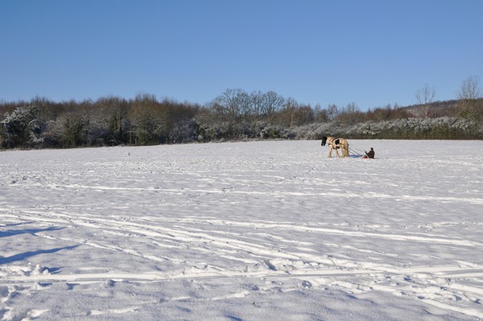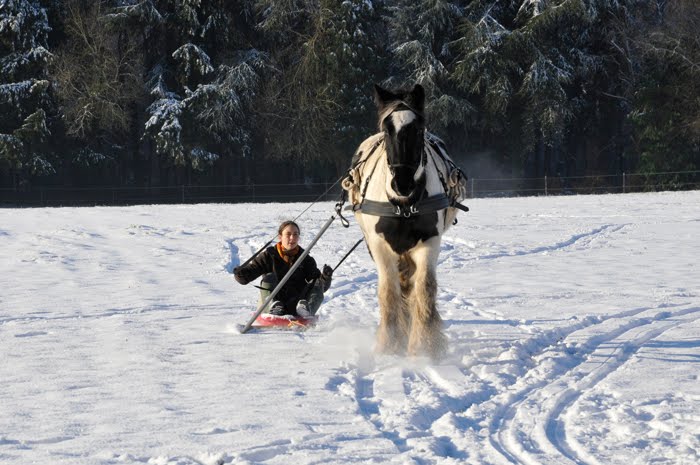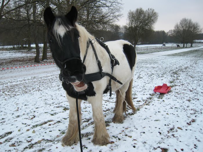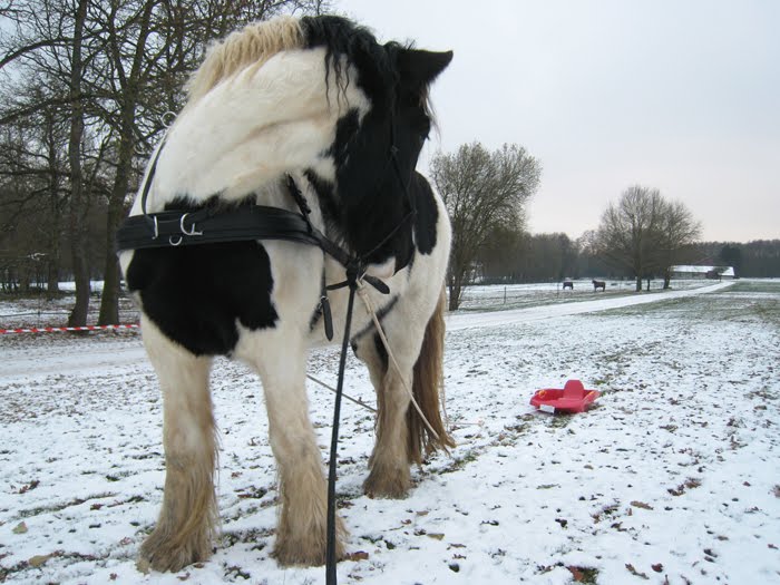 | Dire merci | Merci ^^ Je vous mets dessuite les photos de la séance de ce matin qui était trop bien !!! J'avais hâte de vous montrer ça ! Ayé nous avons testé la luge-joering avec tout l'attirail qui va bien ou presque verdict : je m'en veux énormément d'avoir eu la main un peu lourde, en fait je voyais mal ce que je faisais depuis le ras du sol, et Thorgal avait légèrement plus envie d'aller d'un côté du pré que de l'autre, du coup parfois il était moins léger et moi je le "tenais" un peu, c'était idiot, en licol je ne fais jamais ça !! A travailler ^^ Pis faut dire les rênes frottaient sur le harnais etc, rebondissaient sur sa croupe, du coup je pense que niveau précision c'était vraiment nul, surement pour ça qu'il était moins "fin" dans les directions et que je me suis mise à l'encadrer un peu plus que d'habitude (un peu trop ? ...). A part ça, un Thorgalou super mignon, au départ comme si de rien n'était, après quelques dizaines de mètres quand le poids a commencé à se faire sentir il a un peu calé et marché de travers (je pense qu'il essayait de se dégager de l'effort !), je l'ai remis en avant et zou c'était reparti ! Au trot il était trop bien, c'était plus facile, il a même pris le galop et supporté sans broncher l'arrêt un peu cata : la luge n'a pas de patins fins alors elle glisse aussi vers les côtés parfois, comme le pré était en pente quand Thorgal est repassé au trot je suis partie complètement sur la droite ça a du lui faire bizarre dans le harnais ! Mais bon il s'est arrêté nickel ^^ Prochain coup je me demande si je ne vais pas essayer d'accrocher les brancards directement au niveau de la bricole au lieu de ce que j'ai fais là (attachés au niveau du reculement). Il sera + gêné dans les virages mais la luge devrait moins partir sur les côtés ! Pis je prendrais un "fouet" car là je n'avais rien (j'avais mon stick mais bien trop petit LOL), du coup quand il ne répondait pas assez vite aux transitions montantes j'ai fais comme aux LR en licol : agité une rêne sur la croupe. Je sais qu'en attelage ça se fait carrément pas Enfin heureusement il était tout mignon aux transitions, la voix suffisait bien souvent... c'était trop bien J'aurais du choisir le modèle de luge en bois surélevé sur des patins, car là au ras du sol c'est moins pratique et puis avec des patins, la luge partirait moins sur les côtés ! (photos juste après ^^) |