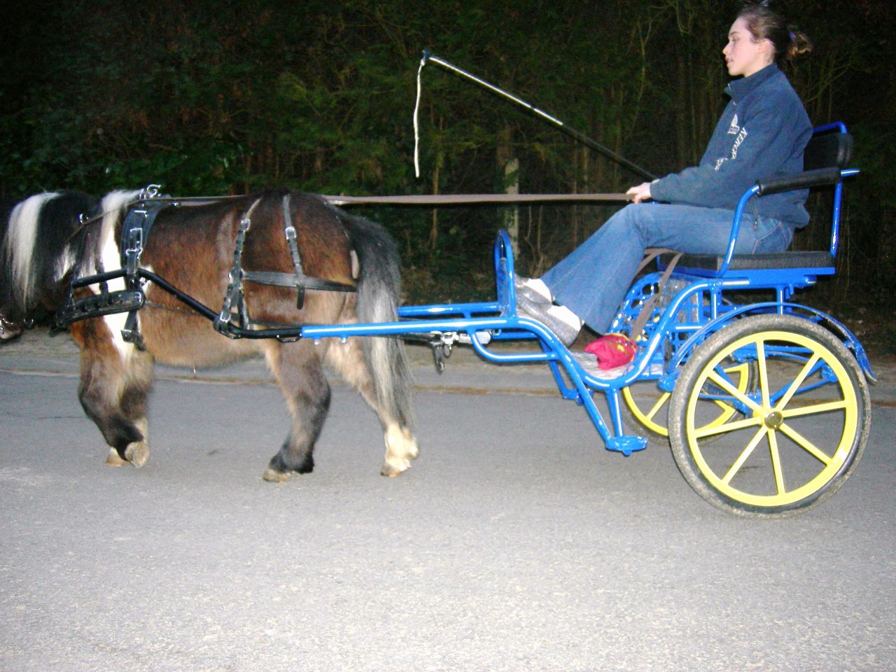 | Dire merci | Avant de changer quelquechose aux brancards, essaie de faire une rotation vers l'extérieur de tes brancards, tu vas reporter le coude vers l'extérieur, ce qui va remonter les brancards et donc rééquilibrer la voiture. Regarde la photo, j'ai certes des brancards moins coudés que les tiens, mais le fait de tourner la partie mobile vers l'extérieur peut en partie régler le problème à condition que la largeur du poney l'y autorise. La solution que tu as indiquée de diminuer l'angle peut aussi être une solution.Tu peux encore rallonger encore un petit peu tes brancards et l'avaloire est trop serrée. Quand les traits sont tendus, tu dois pouvoir passer un poing entre celui-ci et le cheval. La bricole est toujours trop basse. C'est une bien jolie voiture et cela fait un bel ensemble ! |