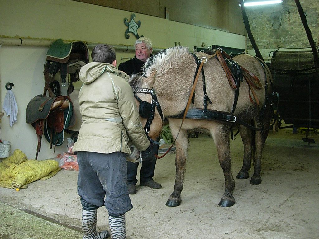 DéconnectéDire merci | eh c'est pas mal tout ça? c'est ou? qui se charge du débourrage de la demoiselle? la voiture est vraiment très bien, avec de grndes roues, c'est parfait. attention de bien sécher le ventre,... avant de la remettre au pré ou au box, sinon, tonte attelage (oui, je crois que ça s'appelle tonte de chasse) on tond l'encolure et le dessous du ventre. pour éviter qu'il ne se mouille. le cheval peut vivre au pré sans couverture avec ce type de tonte. c'est juste une info. pour les fers, pas besoin. un bon vrai parage pied nu et voilà en marchant sur le goudron, le pied va s'endurcir. sinon, hipposandales le temps que ça se fasse. les fers, ça glisse sur le béton... |