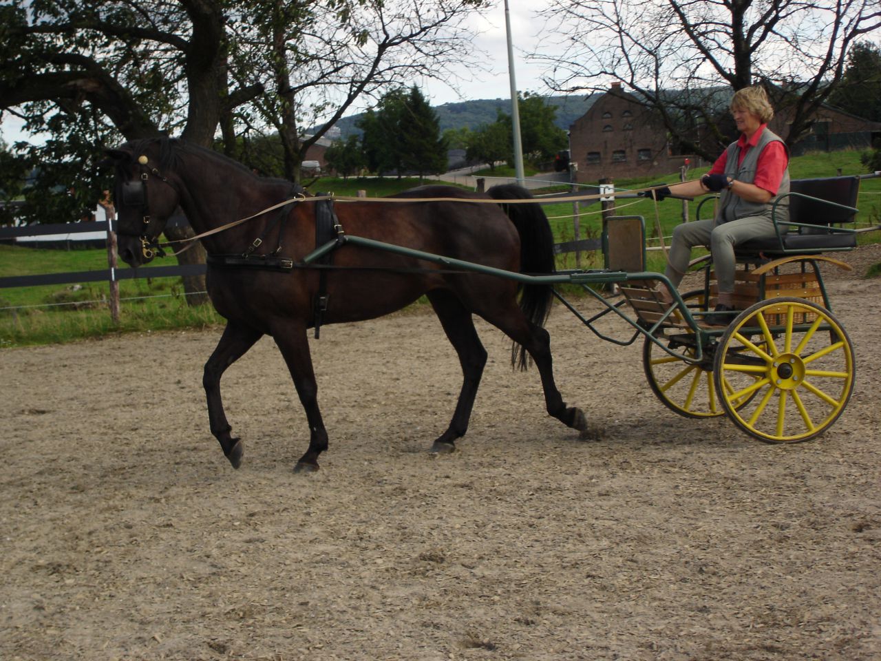 DéconnectéDire merci | j'ai une amie qui vient de faire l'acquisition d'un modèle comme le gig EMD 016B pour sa haflinger. Commerçe est en Suisse donc différent du commerçant mentionné ci-dessus. vraiment pratique et léger, passepartout. pour ce qui est de l'équilibrage, c'est encore trop neuf pour décider, entre la jument et la meneuse. on règle gentiment. j'ai un gig et franchement, je préfère atteler avec le gig à un que la fourgonnette à 2, à un je passe partout et sur tout les chemins, à 2 c'est plus large. la 2 roues a juste un soucis, vu que les brancards sont posés sur le cheval, et ne sont pas libres de mouvement, le mouvement du cheval est répercuté sur la calèche (comparé à une calèche 4 roues qui est posée elle au sol, et le cheval a des brancards mobiles et libres, le mouvement du cheval, sauf de droite à gauche si il "tangue" aucun mouvement de bas en haut) la seule chose à faire, c'est se tenir bien droit, comme si on était à cheval, et de laisser faire la calèche son mouvement de haut en bas, ça se fait très bien. si on veut s'appuyer au dossier, il faut juste le faire uniquement au pas. |