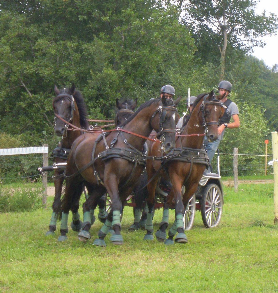 | Alors l'histoire des reculements, oui c'est un grand débat a 4 et en paire aussi. Il faut savoir qu'il n'y a qu'en france quasiment que nous les utilisons... Lors de notre premier concours a l'étranger nous avons fini par les enlever en dressage pour commencer, car un des timoniers ne recule pas très bien ( et oui pourtant le reculement est sensé être fait pour !! ) , et il s'est avéré qu'il reculait mieux sans qu'avec. En même temps les hongrois ne connaissant pas les reculements ( meme a 1 ) cela est compréhensible. Il s'avére que si les harnais sont bien réglés, non les chevaux ne peuvent pas prendre la voiture dans les fesses. Puis nous avons eu de soucis sur le premier inter, une fois la martingale qui se coince dans un piquet, puis l'avaloir, et la on a compris pourquoi presque personne n'en mettait a 4. Plus il y a de morceaux de cuire plus il y a de chances d'en accrocher quelque part ... deux descentes de groom pffffAlors oui manque des portes traits sur les timoniers ... faut qu'on s'en procure. Pour dominique : les volées n'ont de toute facon j'amais d'avaloirs, ils ont des portes traits avec des élastiques pour qu'ils reviennent toujours a leur place ... ![]() Voila pour la petite histoire. Après pour avis personnel, je trouve qu'en dressage , on voit mieux les chevaux sans les avaloirs, c'est plus épuré, je préfère esthétiquement parlant. Message édité le 10/08/11 à 08:00 |