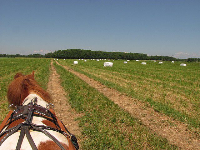 | Dire merci | Un beau galop dans les champs de foin ce matin! Nous suivons une piste de tracteur, donc pas de risque de marcher dans un trou de marmotte! |