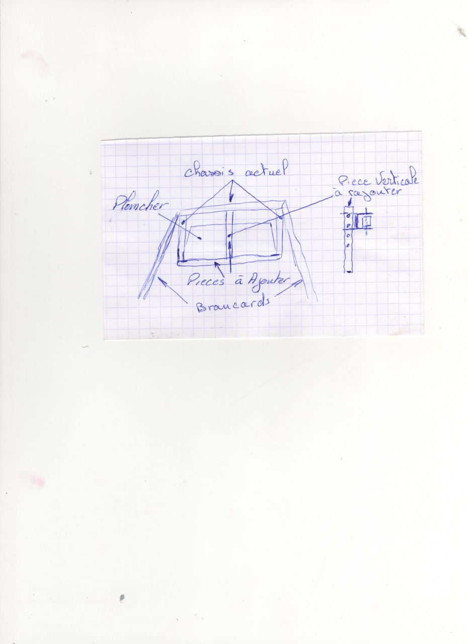 | Dire merci | salut minipassion je te joint un petit croquis qui pourra peut etre t'aider je te propose de renforcer ta carriole 1:tu rajoutes sur le bas au niveau du plancher une barre horizontale entre les 2 montants existants 2: dans le cadre ainsi fait tu rajoute verticalement à égale distance des 2 cotés une barre que tu auras au préalable percée . 3: sur cette barre verticale (percée d'autant de trous que tu le souhaite ) tu viens fixer une piece à fabriquer selon ton souhait et sur laquelle tu positonneras ton palonnier que tu pourras ainsi regler en hauteur . palonnier que tu auras bien entendu enlevé de son emplacement actuel. si tu le raccourci un peu cela ne sera pas plus mal (quelques cm de chaque coté) ![]() je l'ai fait à main leve ce n'est qu'une idée cordialement |