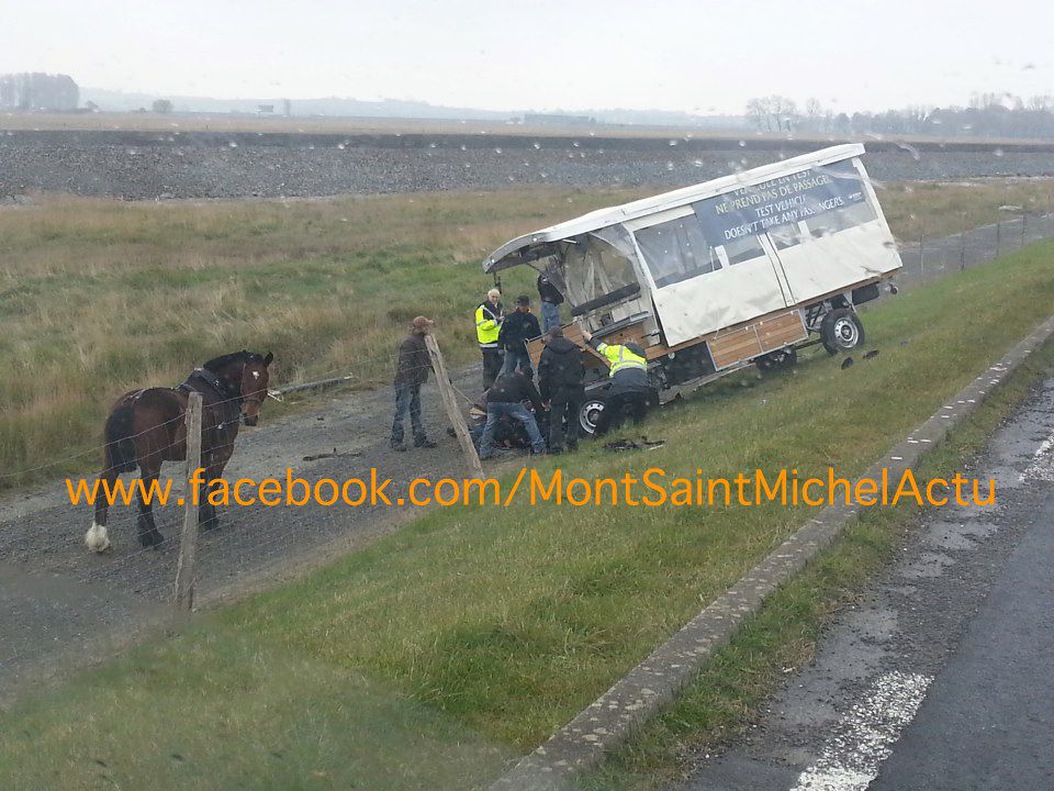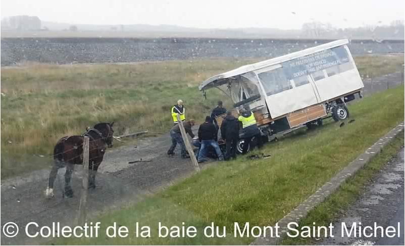 | Dire merci | Le 08 avril dernier, un accident a eu lieu au Mont-Saint-Michel. Le site subit de lourd travaux qui ne font pas du tout l'unanimité. Pour accéder au Mont, un projet de navette attelée avait vu le jour mais en Aout dernier, le projet avait été annulé car les véhicules hippomobiles ne passaient pas les normes de sécurité. Visiblement, un nouveau projet avec de nouvelles voitures (maringotte) a été mis en place mais on dirait que ce nouveau projet tombe aussi à l'eau... ![]() ![]() Le discours officiel : Les maringottes, ce sont ces voitures hippomobiles, mises en place par Véolia en même temps que les nouvelles navettes pour accéder à la Merveille. Ce lundi matin, l'une d'entre elles est tombée de la digue, dans le bas-côté. Mais ni les cochers, ni les chevaux n'ont été blessés. Les voitures, retoquées l'an passé pour raisons de sécurité, seront remises en service en juin prochain, n'accueillant que 25 passagers au lieu des 55 initialement prévus. Elles sont donc en phase de tests extrêmes. C'est dans ce cadre que l'incident s'est produit. Une balayeuse mécanique est passée à proximité d'une maringotte, effrayant l'un des deux chevaux. Ce dernier a fait un écart et entraîné l'attelage dans le bas-côté. L'accident, heureusement sans gravité, montre que travailler avec des chevaux de trait n'est pas sans risque. Ces animaux, d'un naturel peureux, ont en effet besoin d'apprendre à rester calmes et confiants en toutes circonstances. Le but même des tests actuellement effectués par les meneurs. Sauf que le maire a annoncée lors d'une assemblée le 17 avril que le cheval ne s'en était pas sorti... Qui dit vrai ? L'attroupement que vous voyez à l'avant de la voiture, ce sont des personnes qui tentent d'extraire le cheval de sous la voiture... Donc il y aurait bien une victime... L'incident s'est produit lors d'un exercice. La balayeuse n'était pas là par hasard. L'exercice consistait à faire croiser une balayeuse avec l'attelage afin de tester la voiture et les chevaux... Il y a-t-il eu de la désensibilisation avant de se lancer dans un tel exercice ? Bref, imaginez le résultat avec 25 personnes à l'intérieur... Ou les 50 prévu dans le premier projet... Triste histoire... ![]() |