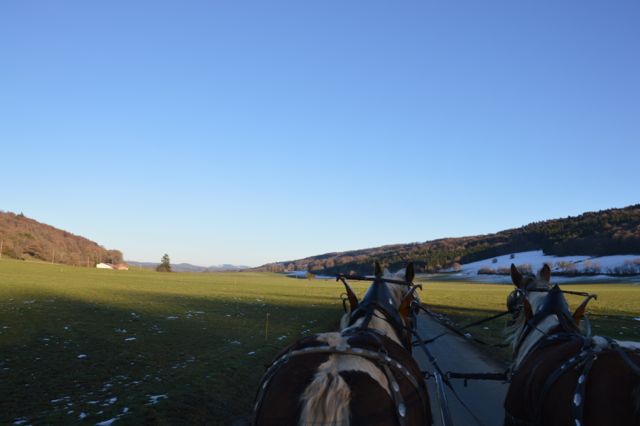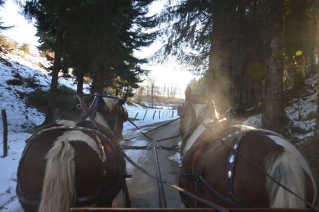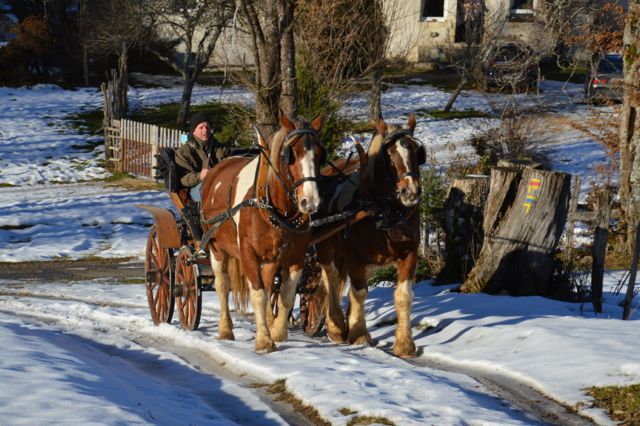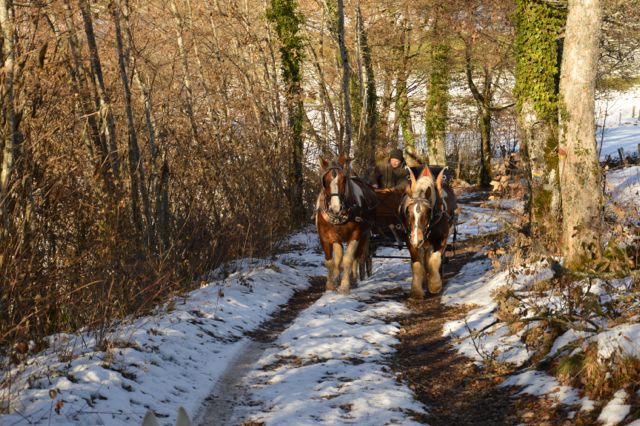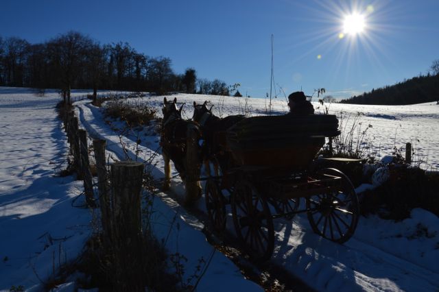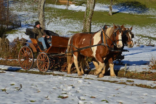 | Dire merci | Et essai du nouvel apn Volcan a l'écoute du meneur ![]() Mais d'humeur taquine aujourd'hui... le froid peut être, il fait - 4° Ugolin est surtout concentré sur les frasques de Volcan ![]() La doctorwagen passe à peu près partout ![]() Mon homme mène et je fais le groom-photographe ![]() Une petite montée réchauffe les chevaux ![]() Et le groom-photographe... ![]() ![]() Les ombres s'étendent, le froid devient mordant et les chevaux pressés de rentrer (les passagers aussi). Les 3 derniers km seront vite bouclés: trot et petit galop |