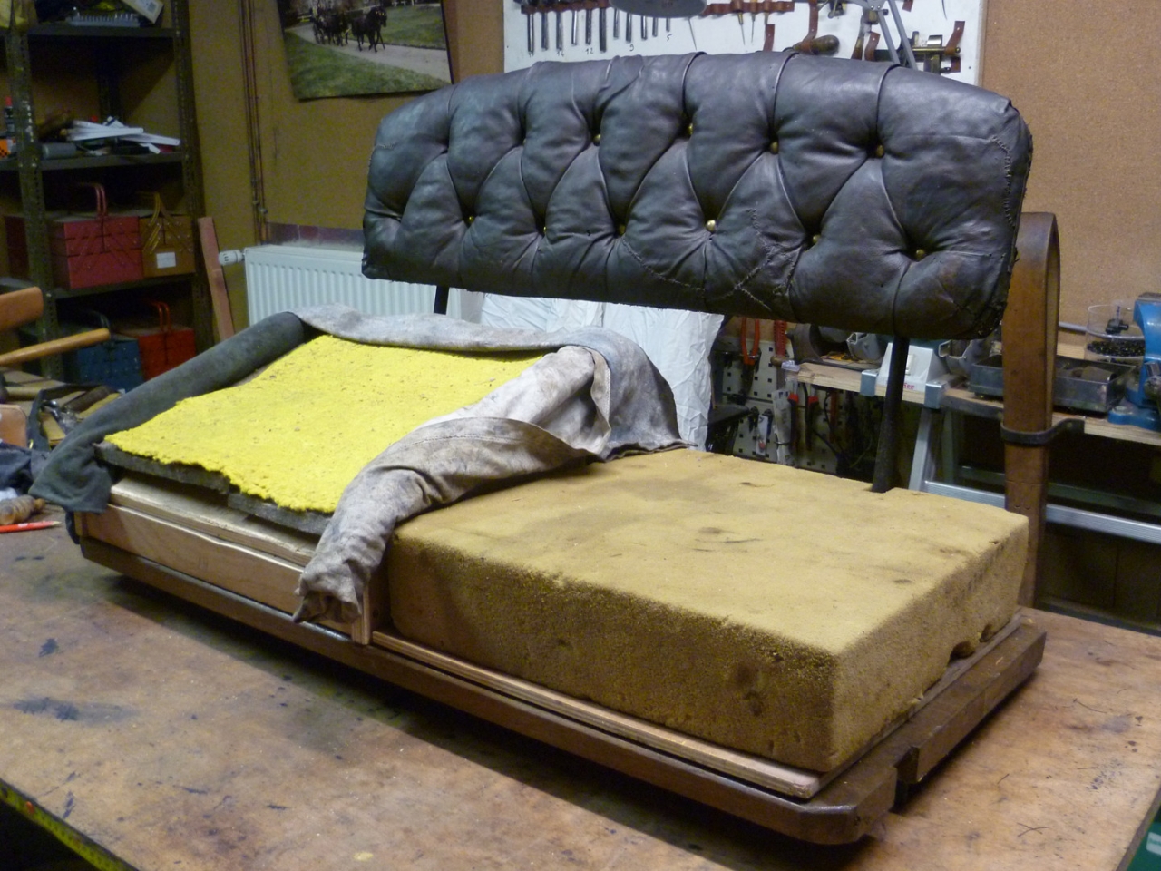 | Dire merci1 | 1 réflexion et une réponse: J'ai une sorte de sulky d'entraînement 'fermé', c'est-à-dire comportant une barre droite du siège au brancard (pour plus de solidité) difficile à enjamber quand on monte en voiture. Le vendeur m'a expliqué que les utilisateurs s'asseyaient sur le siège par l'arrière, puis faisaient basculer leurs jambes par-dessus la barre latérale pour se retrouver face à l'avant. du coup, j'ai commandé cette voiture avec seulement une demi-dossier du côté droit: le meneur est ainsi bien encadré (et un éventuel coussin de guides est bien fixé) et le passager, bien que n'ayant pas de dossier, a les mains disponibles pour se tenir à la barre sous le siège. Siège pour meneur: on peut utiliser un simple coussin (bien dur) en pente que l'on pose sur le siège, qui se coince contre le dossier ou que l'on fixe avec des courroies qui encourent le siège. On peut aussi refaire la menuiserie du siège comportant ce coussin: ![]() Le bois est ensuite garni de feutre (incompressible) du côté du meneur, et de mousse (confortable) du côté du passager, puis le tout est recouvert de cuir: ![]() ![]() |