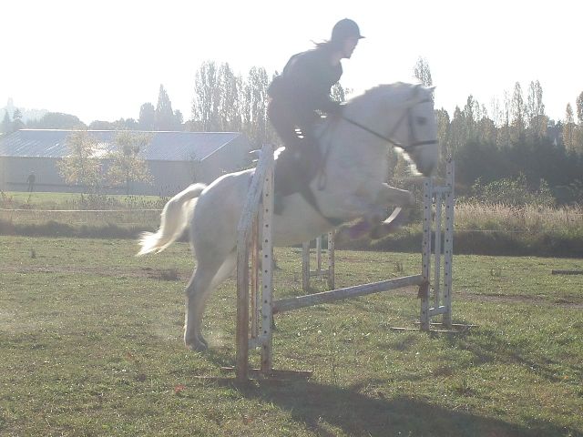 | Dire merci | hello, avant je montais une camargue en saut, mais elle pilait souvent, à cette époque elle vait un sale caractère. sinon elle sautait pas trop mal ,j'ai fait jusque E2 avec. maintenant elle est en club et fait les petites épreuves avec les débutants! son point fort c'est qu'elle tournait cours pour les barrages. une tite photo en E3 ou E4avec moi:![]() |
