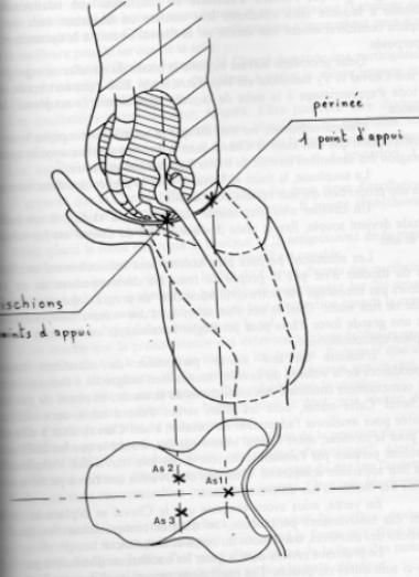 DéconnectéDire merci | Si je peux me permettre et à mon avis, point d'appuis sur les deux ishions, oui, mais pas sur le pubbis, plutôt sur le périnée qui est situé plus entre les jambes. L'appui sur le pubbis (en plus d'être douloureux parfois) bloque le rein en position cambré ou alors le cavalier est penché en avant. En fait la position assise à cheval ressemble à la position debout... Je crois que plus que la place de la jambe, ces points d'appuits sont importants car de là, si l'on se décontracte suffisemment, la "bonne" position tombe plus ou moins naturellement. |